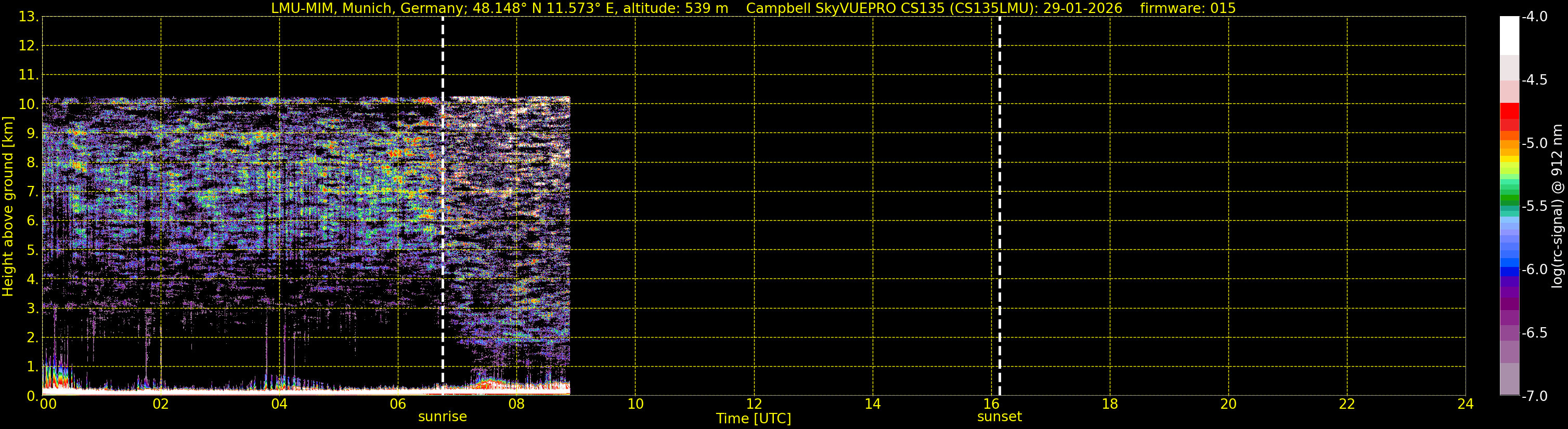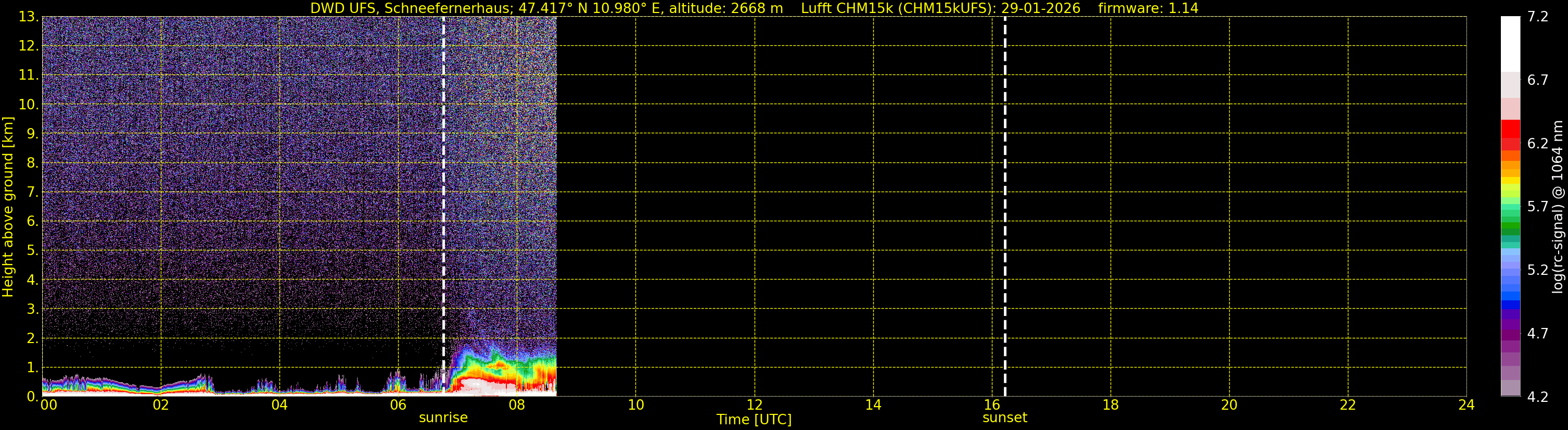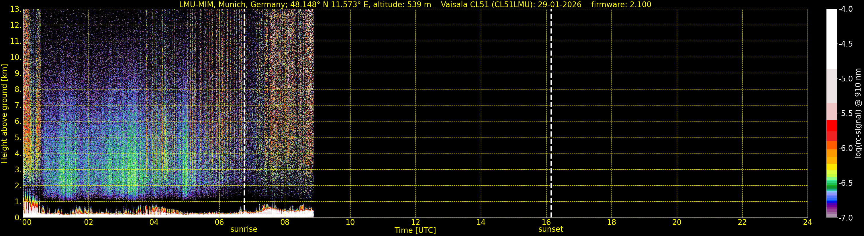 We are grateful that we are allowed to process the corresponding data (since 1. June 2010) of the CHM15k ceilometer located at the Umweltforschungsstation Schneefernerhaus on Zugspitze (UFS, altitude 2712 m, 93 km south of Munich), owned by the UFS and operated by the German Weather Service for comparison.