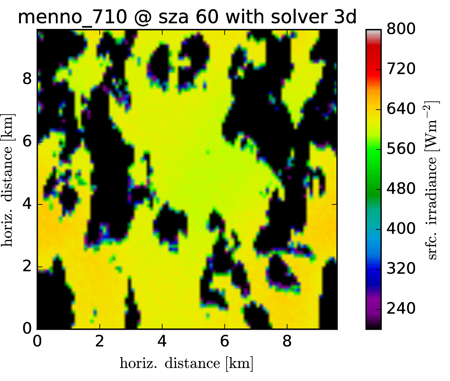 The cloud field has strong aspect ratios with horizontal resolution of 100m and a vertical resolution of 12m, encompassing 96 * 96 * 456 voxels. One particular problem, it seems, are the heat spots which are generated at the surface. It was known before that the Tenstream is not very diffusive with only two streams in the vertical and to represent the horizontal spread of diffuse radiation correctly, we now introduce 8 streams also for the vertical propagation of radiation.