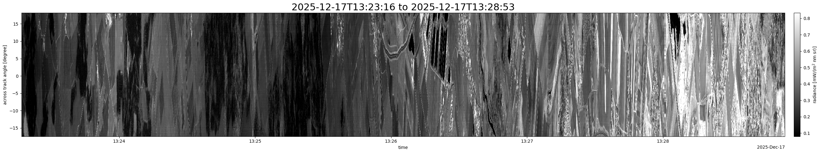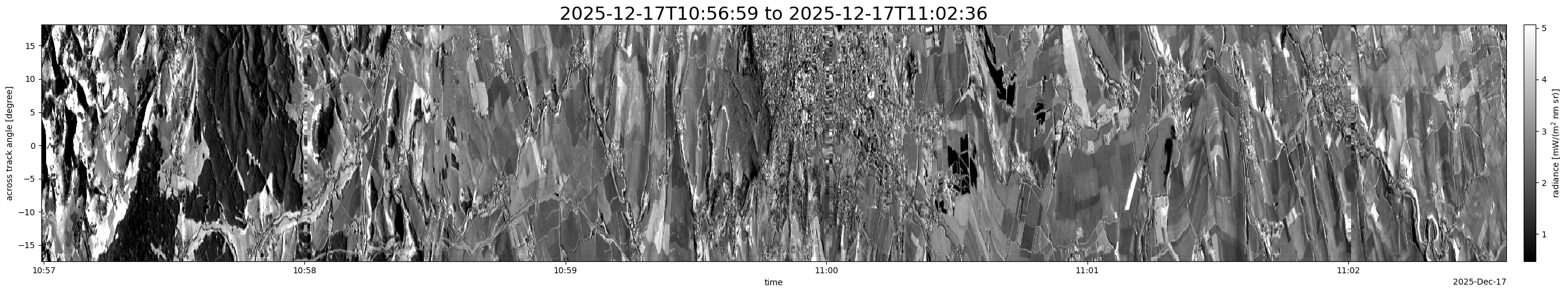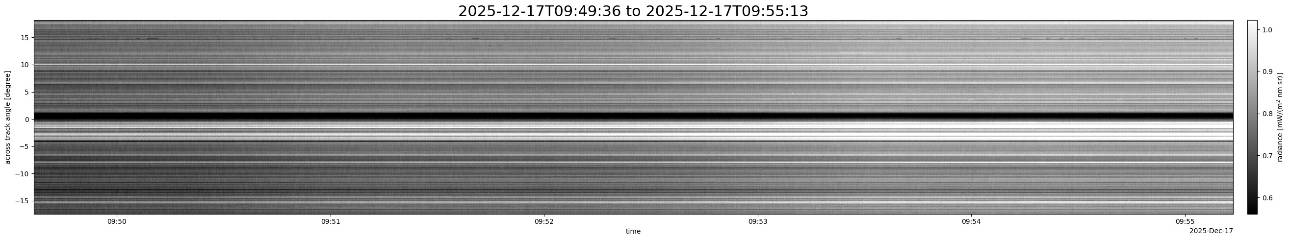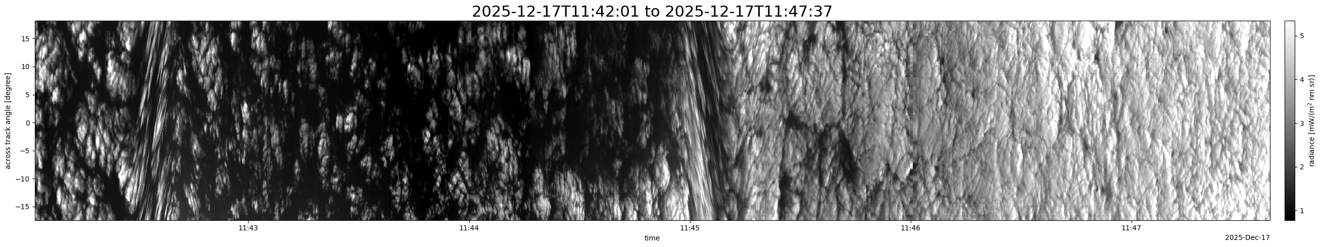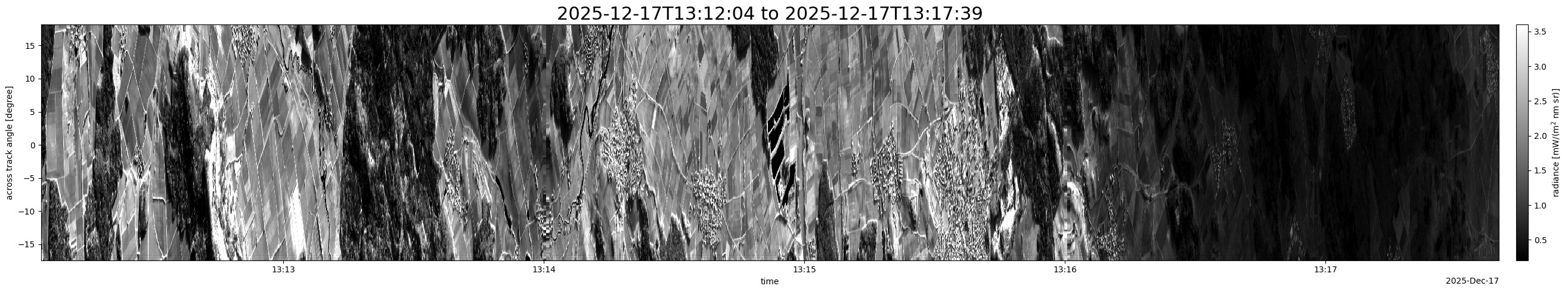 Note that due to the scanning nature of the sensor, the across-track axis is angular resolved while the along-track axis (time-axis) is linear along the flight track.
