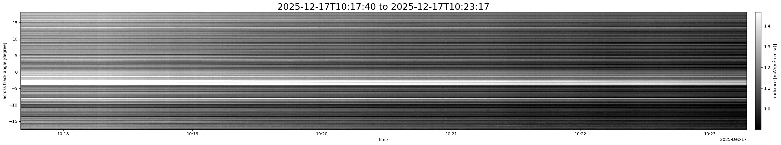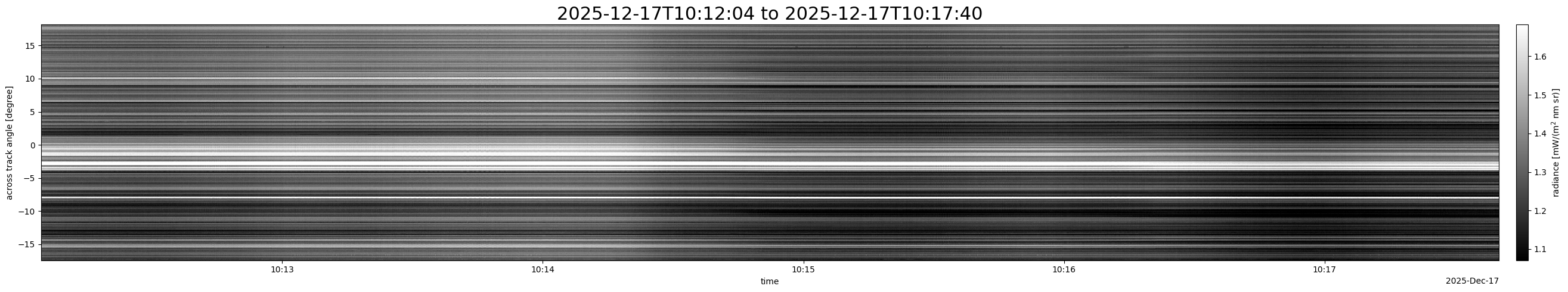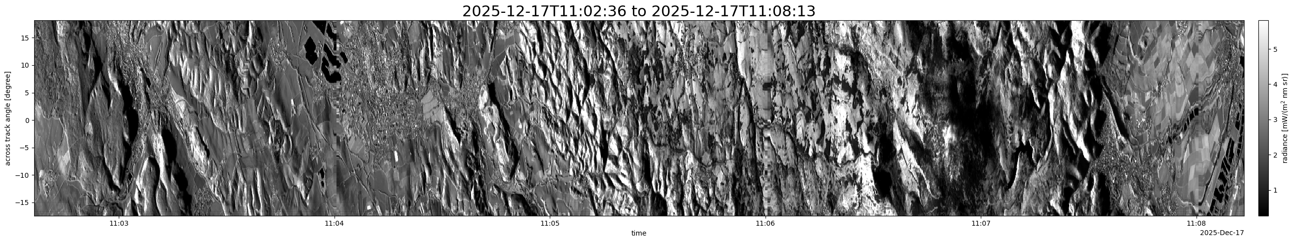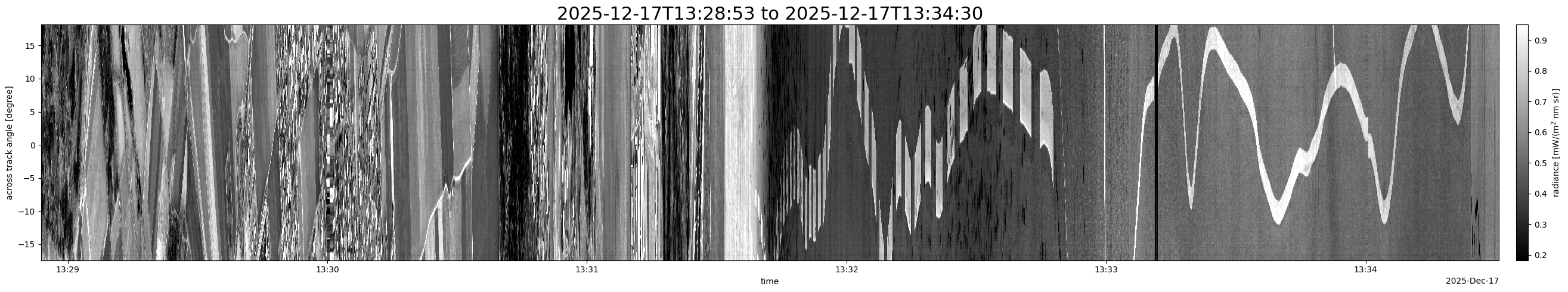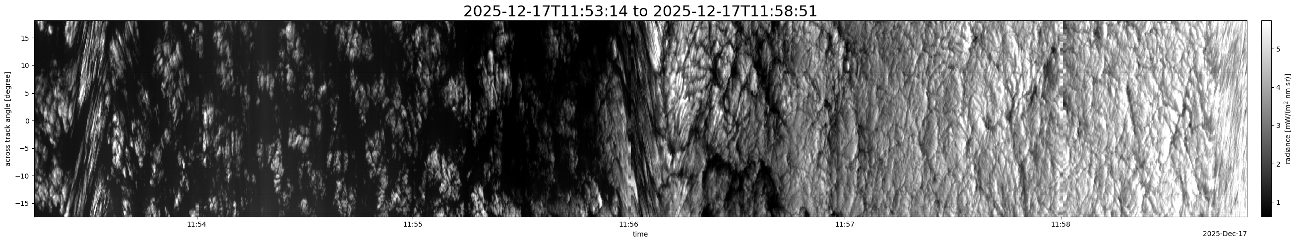 Note that due to the scanning nature of the sensor, the across-track axis is angular resolved while the along-track axis (time-axis) is linear along the flight track.