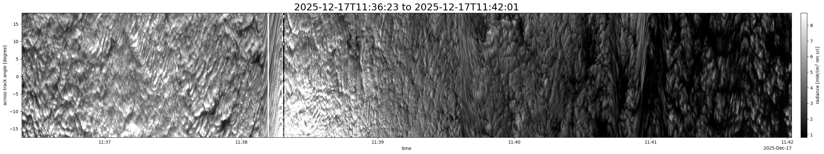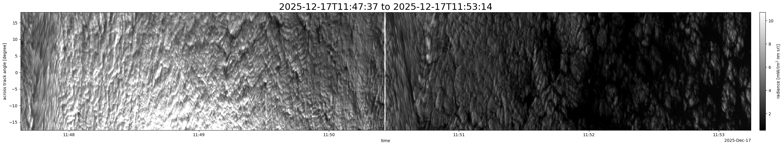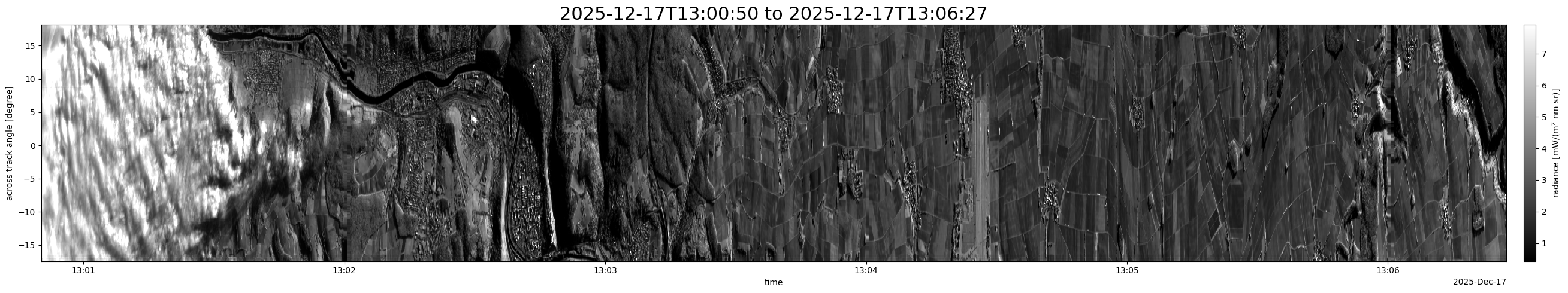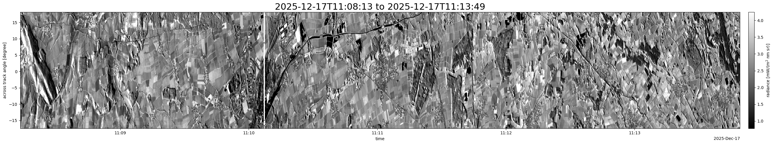 Note that due to the scanning nature of the sensor, the across-track axis is angular resolved while the along-track axis (time-axis) is linear along the flight track.