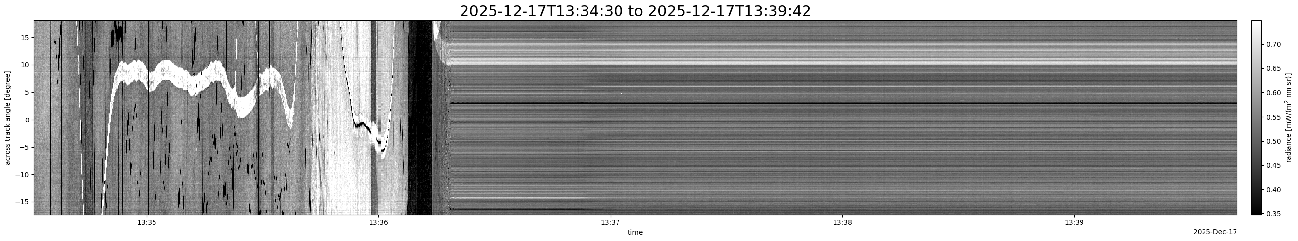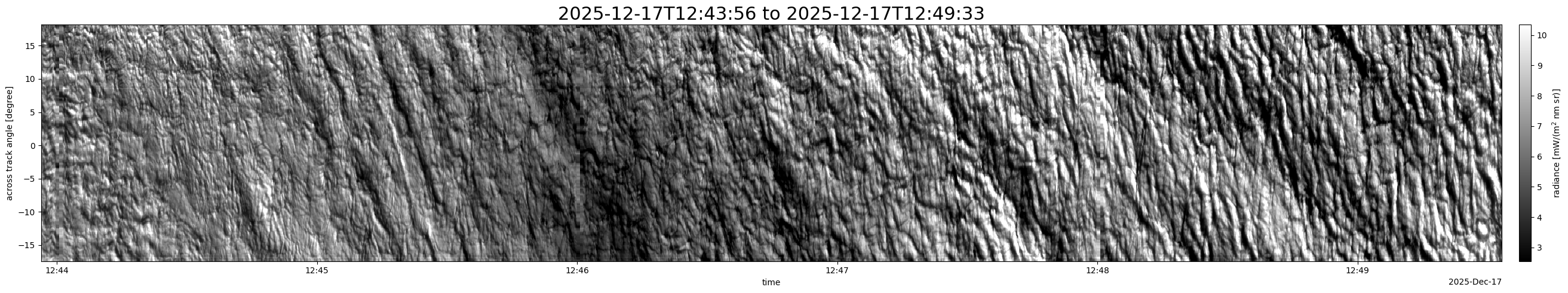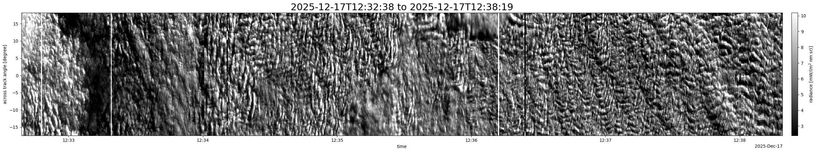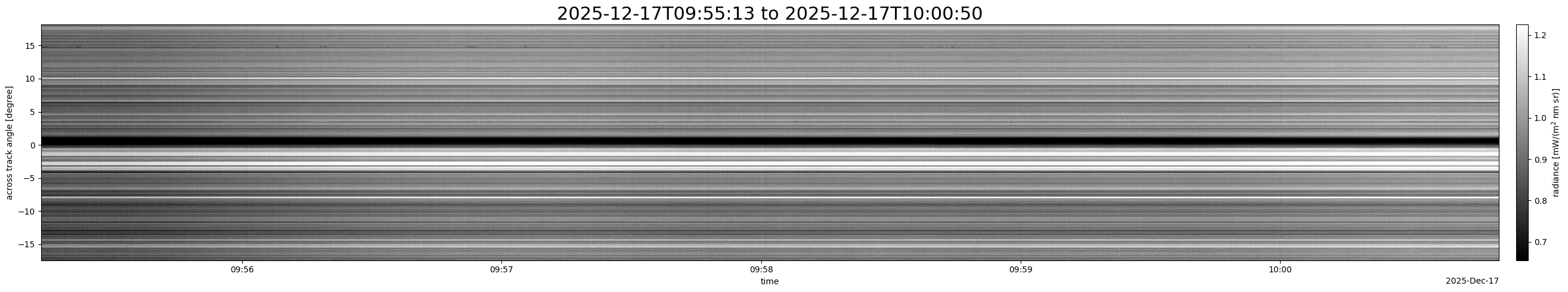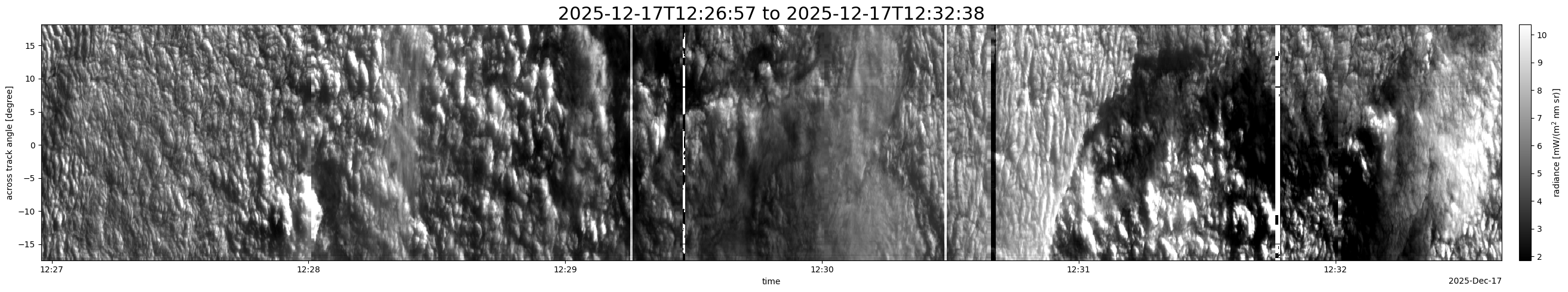Note that due to the scanning nature of the sensor, the across-track axis is angular resolved while the along-track axis (time-axis) is linear along the flight track.