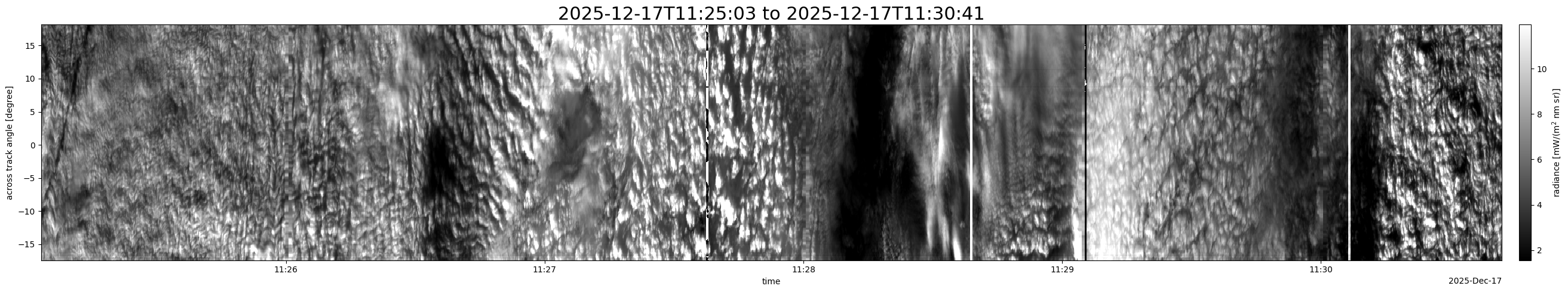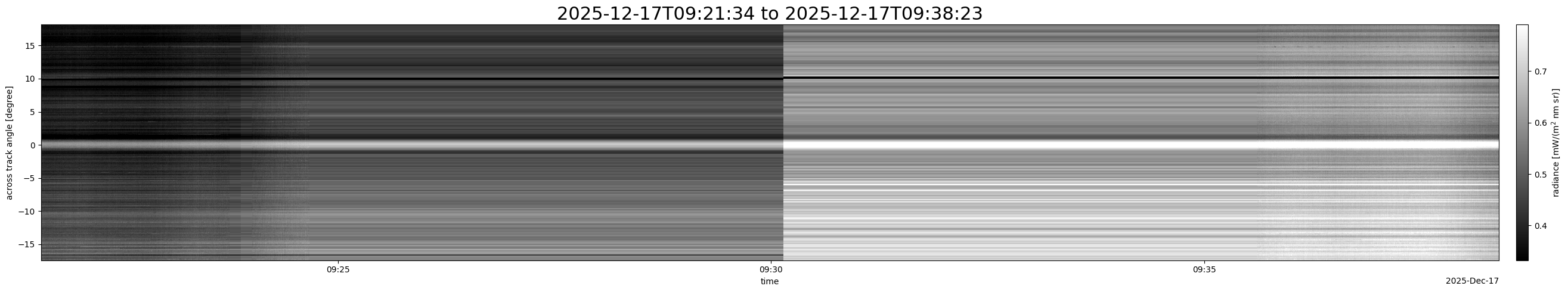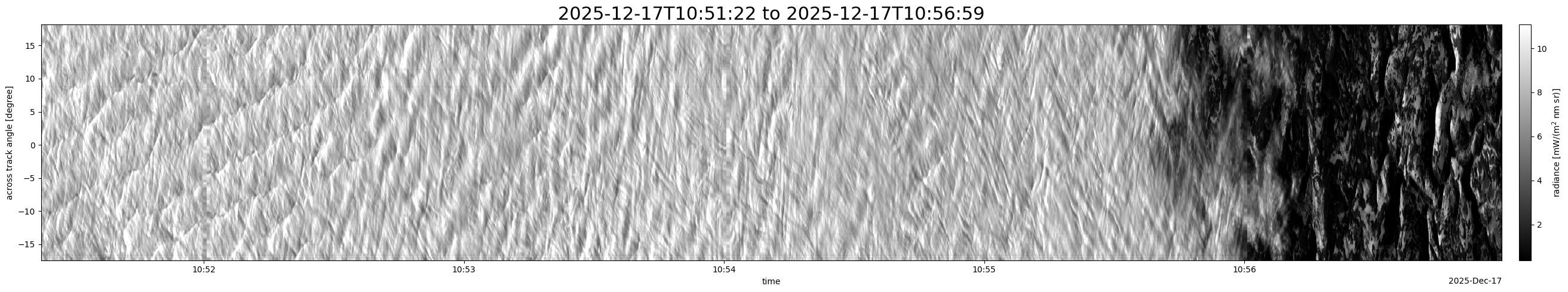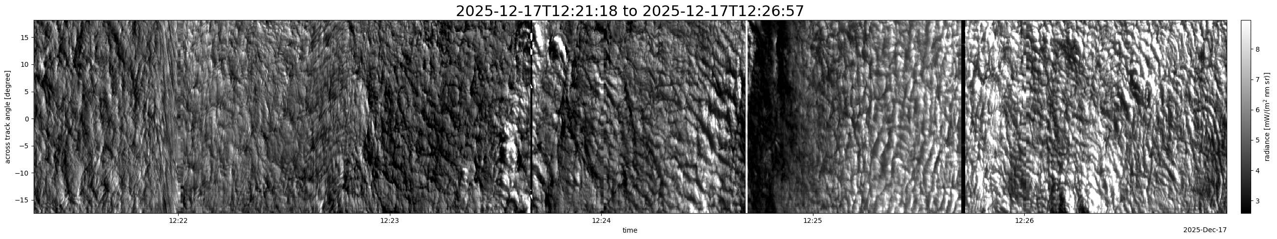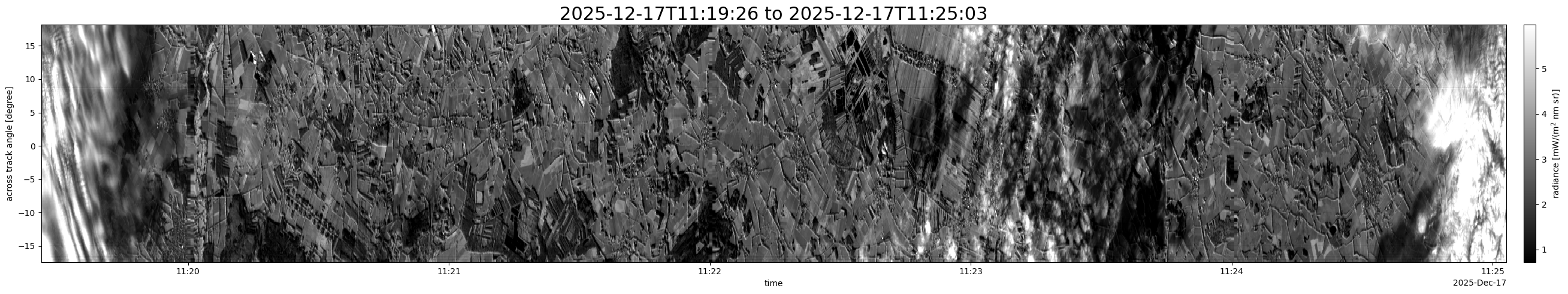 Note that due to the scanning nature of the sensor, the across-track axis is angular resolved while the along-track axis (time-axis) is linear along the flight track.