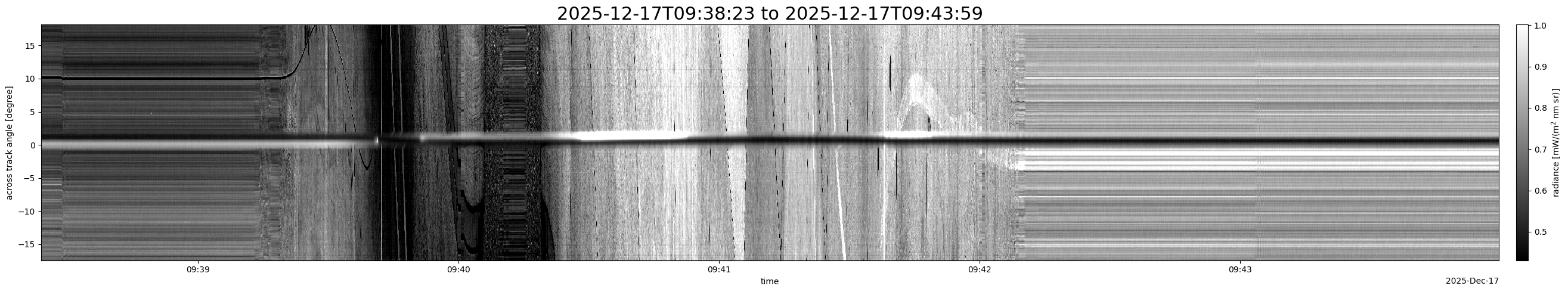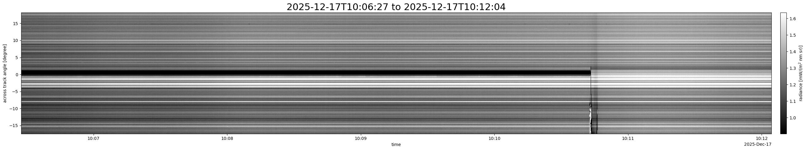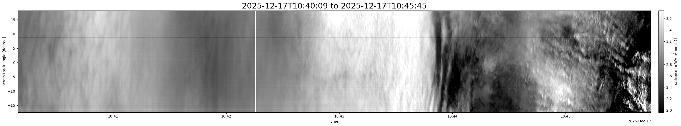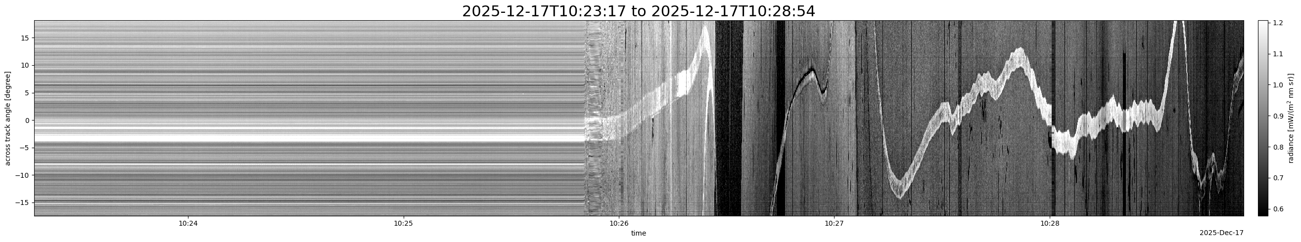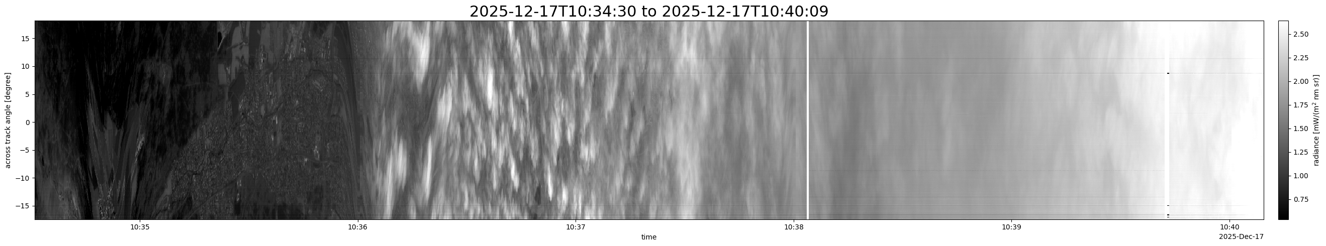 Note that due to the scanning nature of the sensor, the across-track axis is angular resolved while the along-track axis (time-axis) is linear along the flight track.