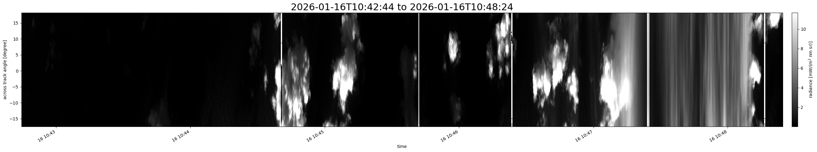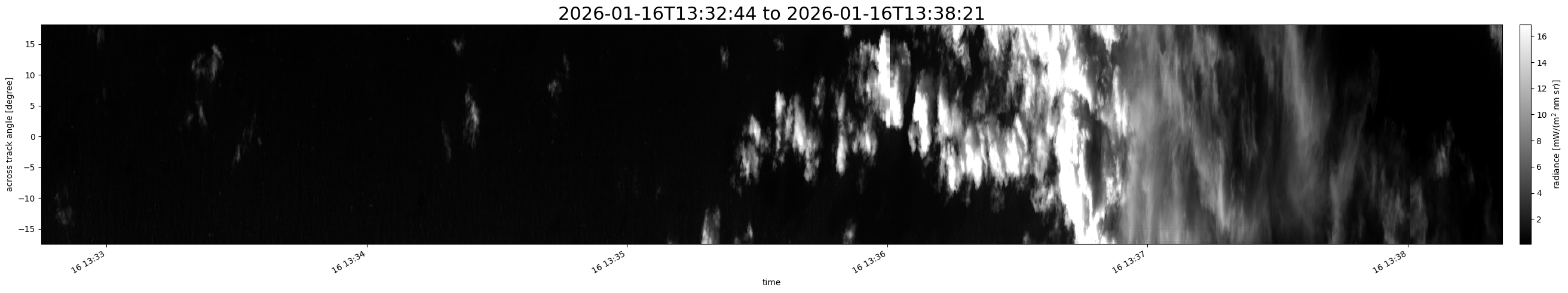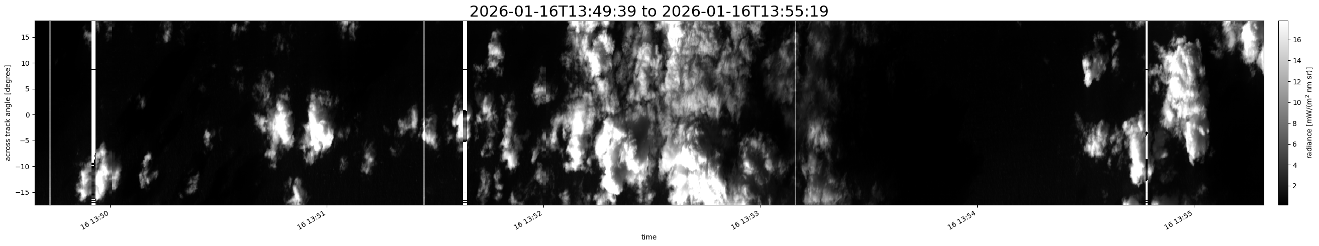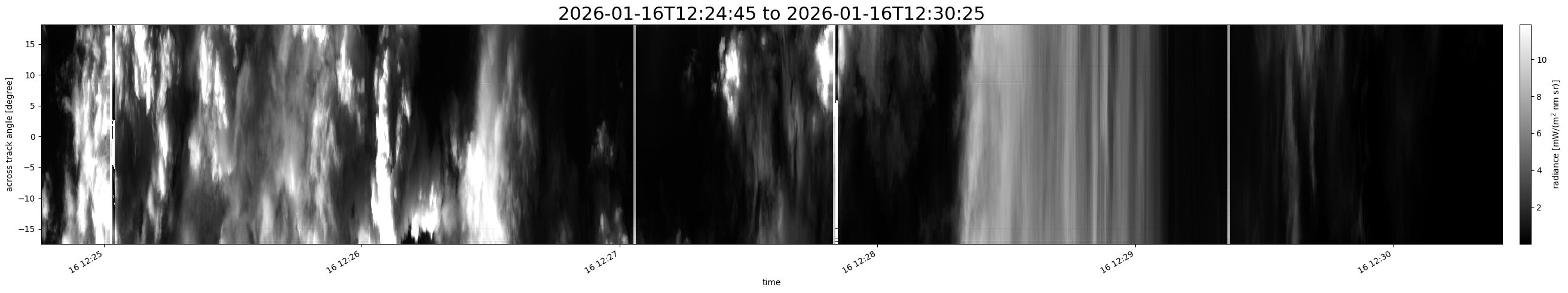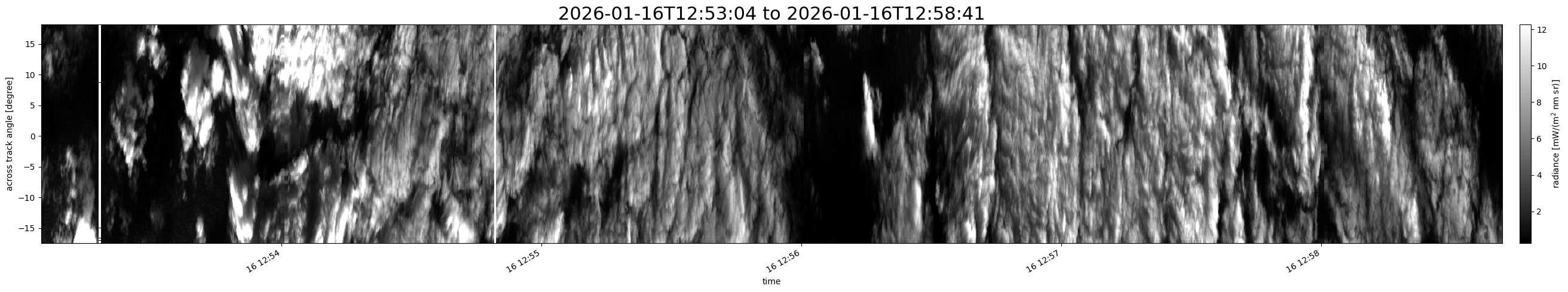 Note that due to the scanning nature of the sensor, the across-track axis is angular resolved while the along-track axis (time-axis) is linear along the flight track.