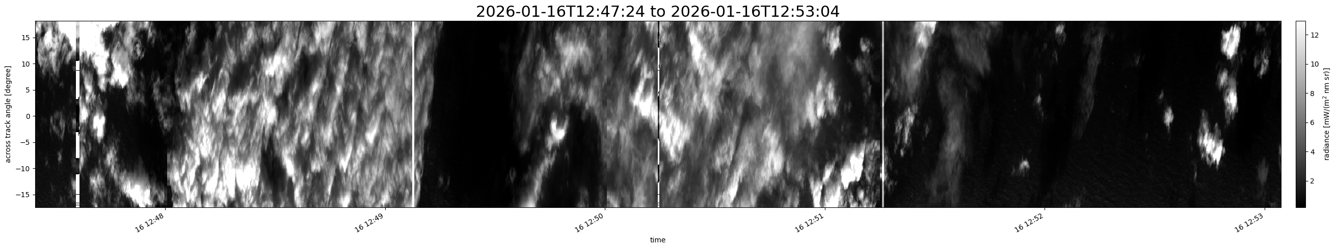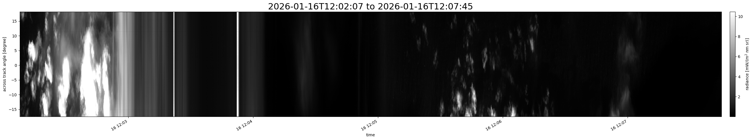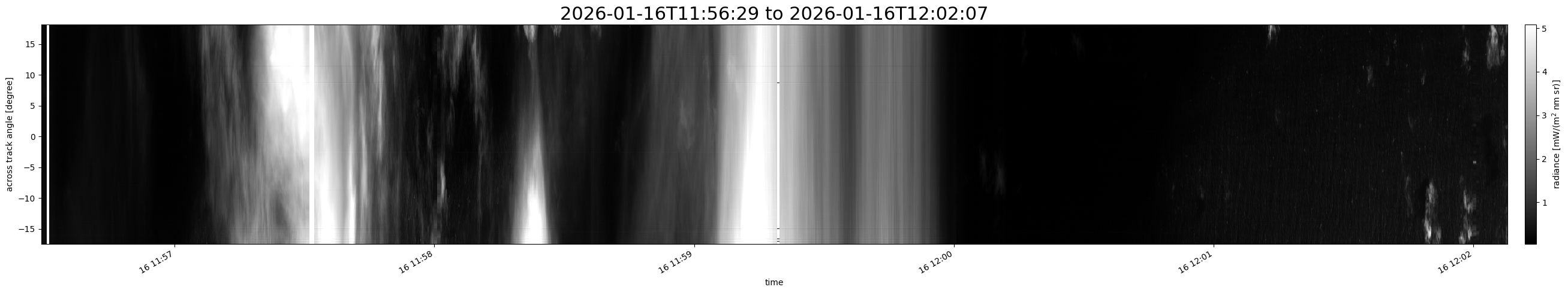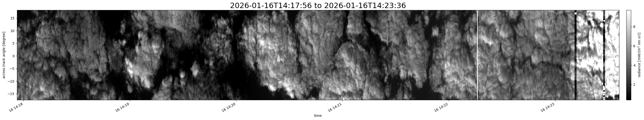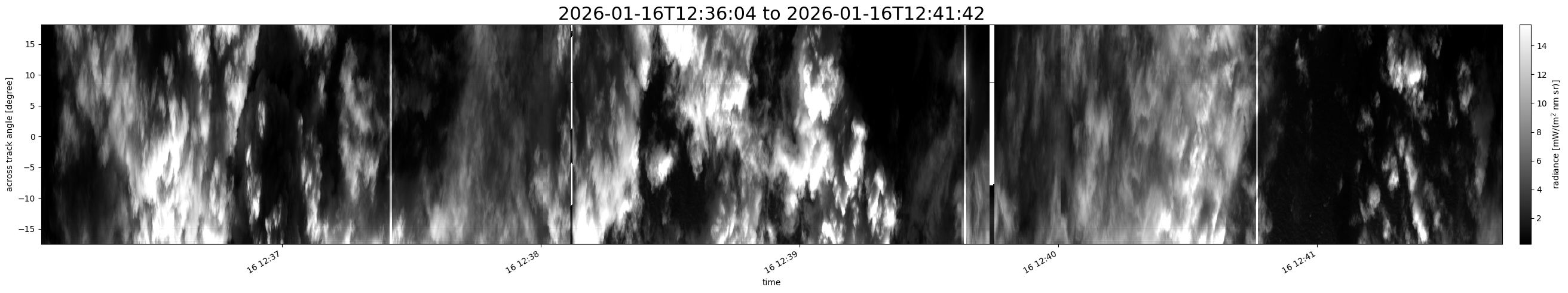 Note that due to the scanning nature of the sensor, the across-track axis is angular resolved while the along-track axis (time-axis) is linear along the flight track.