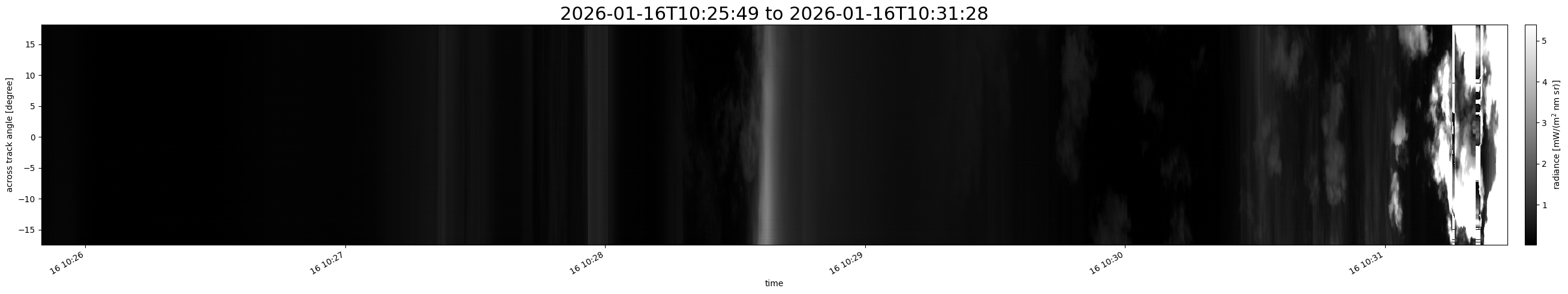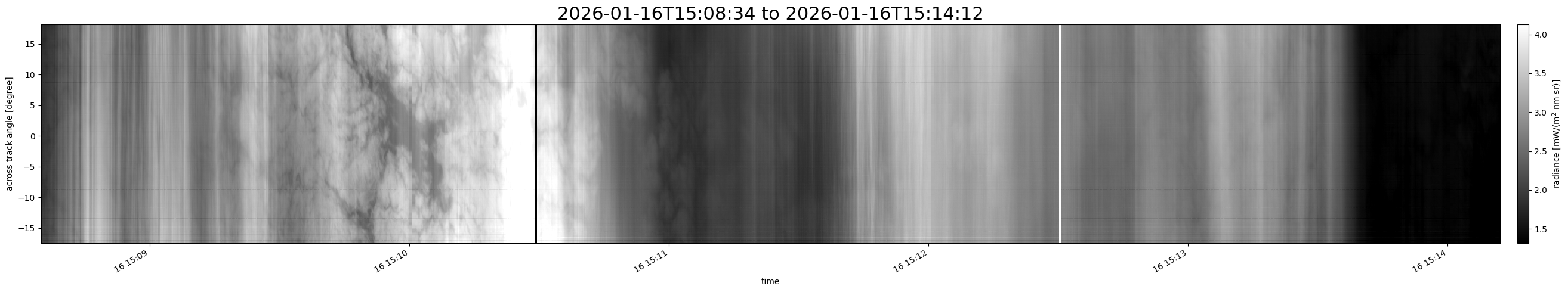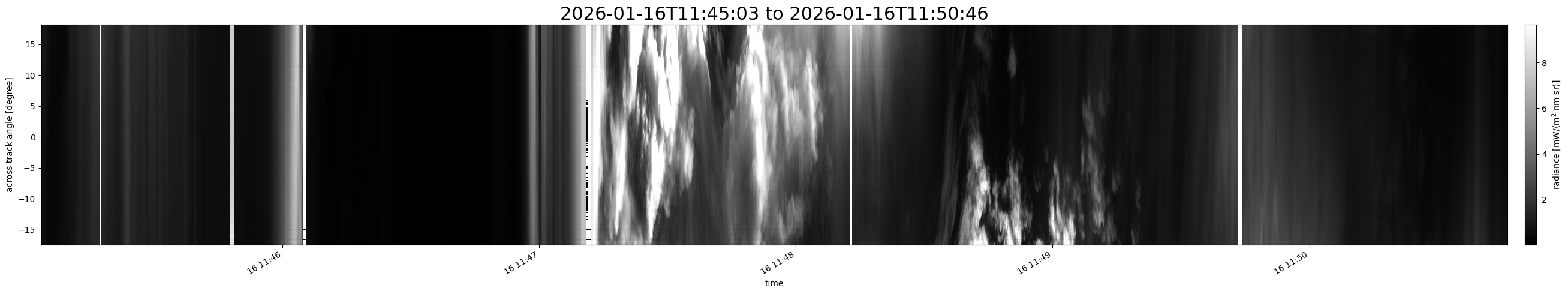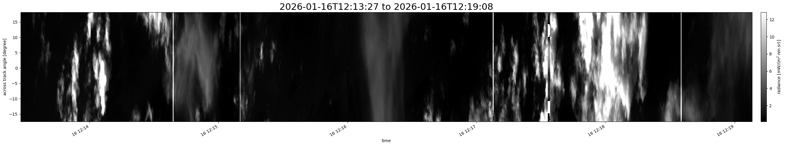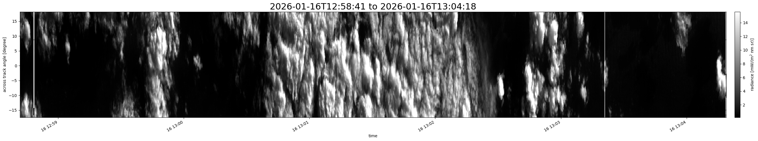 Note that due to the scanning nature of the sensor, the across-track axis is angular resolved while the along-track axis (time-axis) is linear along the flight track.