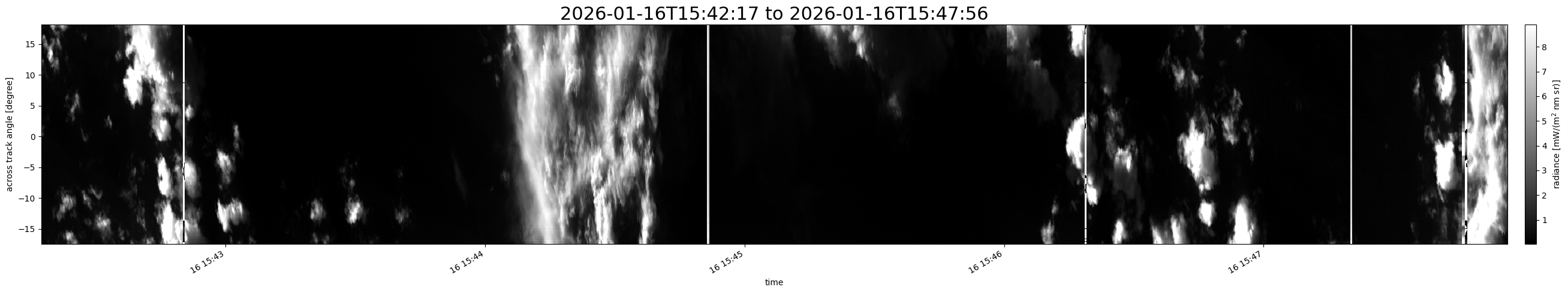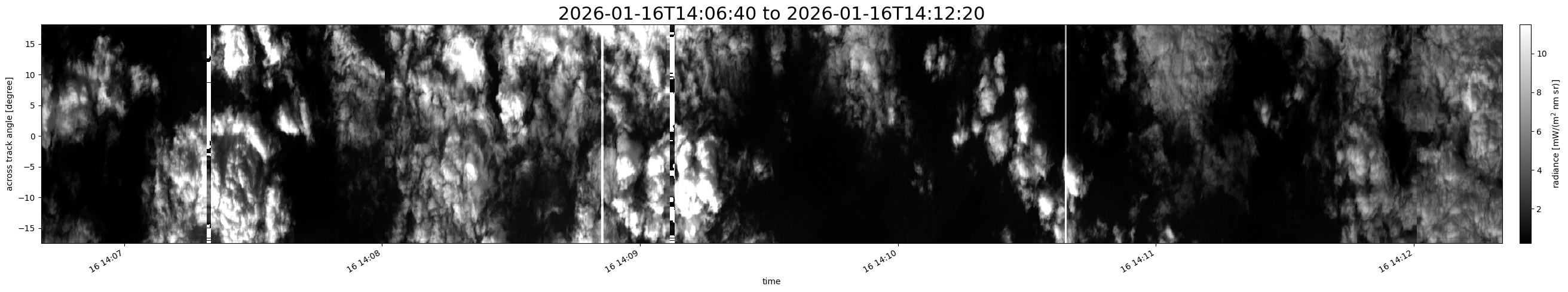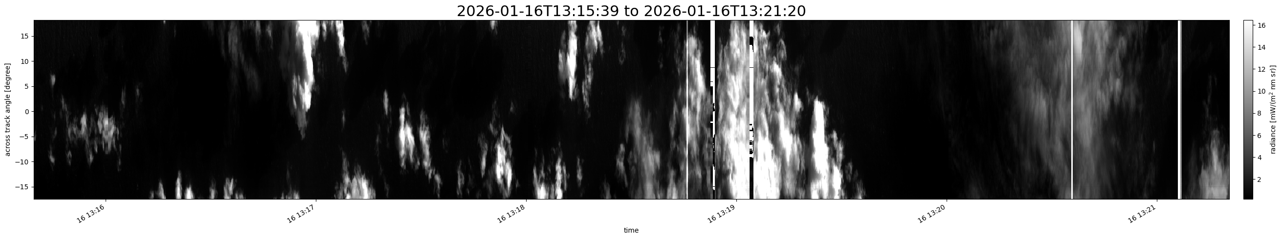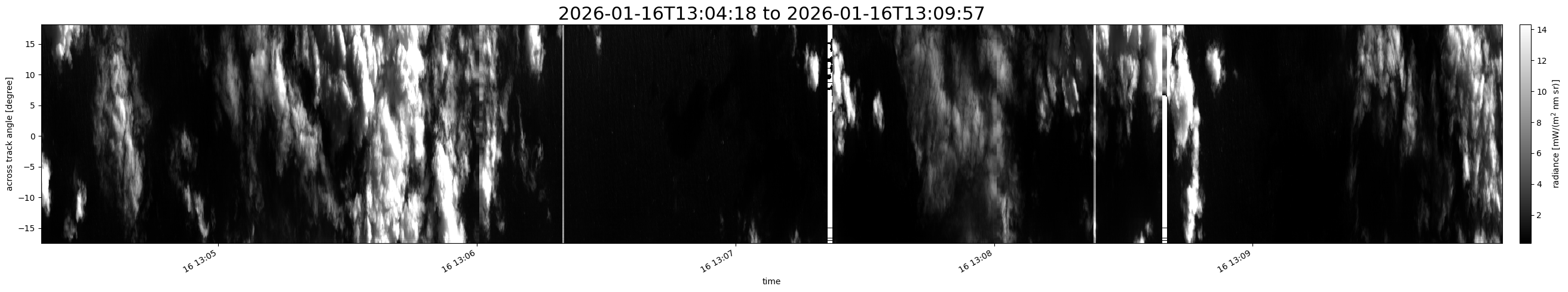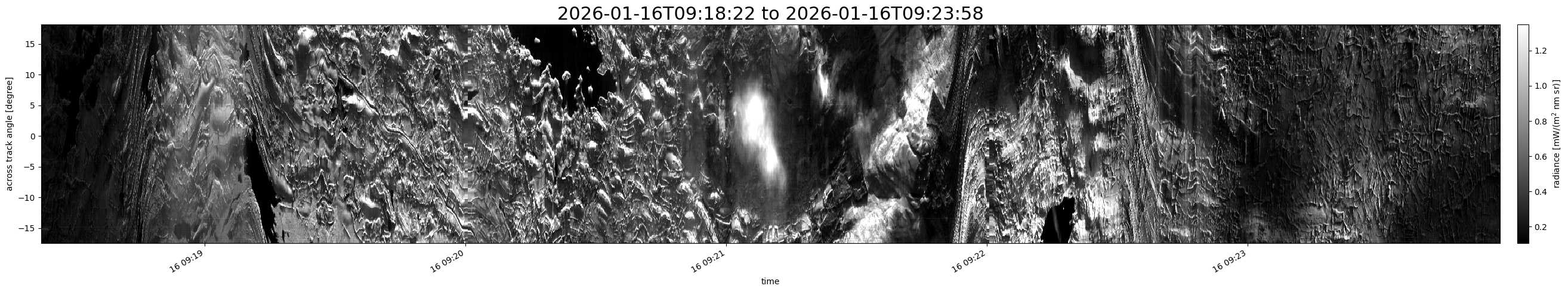 Note that due to the scanning nature of the sensor, the across-track axis is angular resolved while the along-track axis (time-axis) is linear along the flight track.