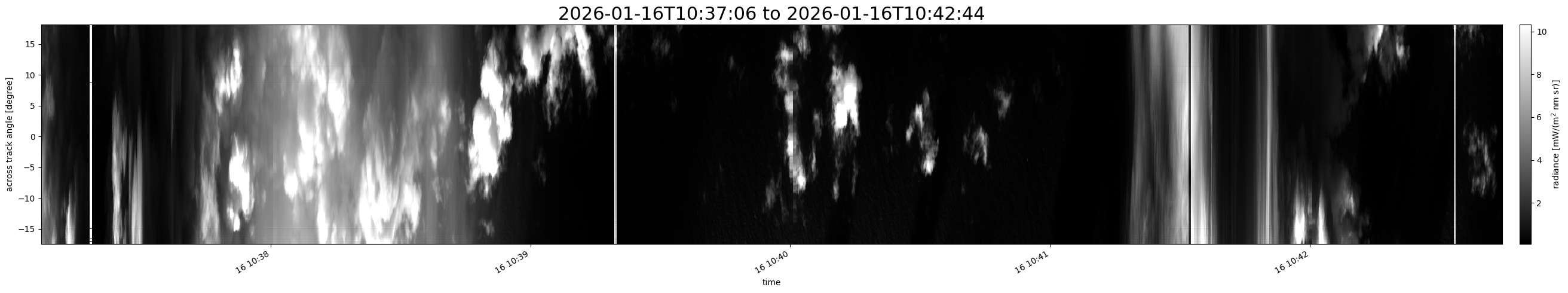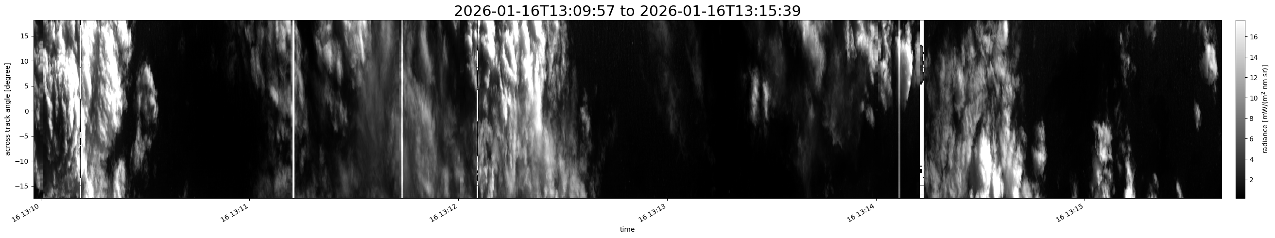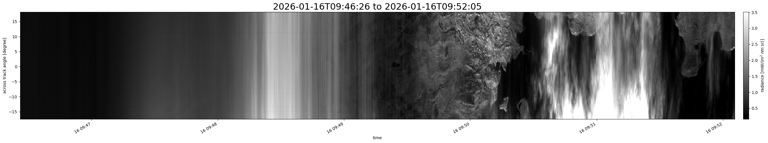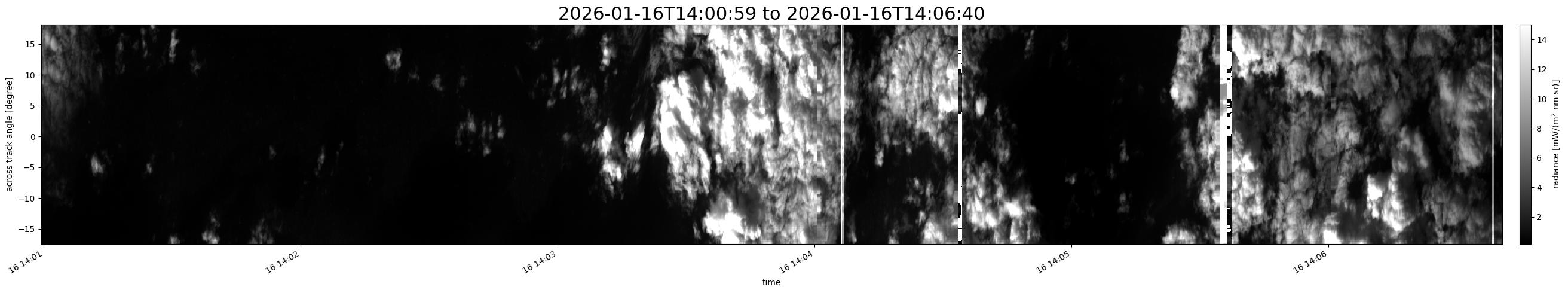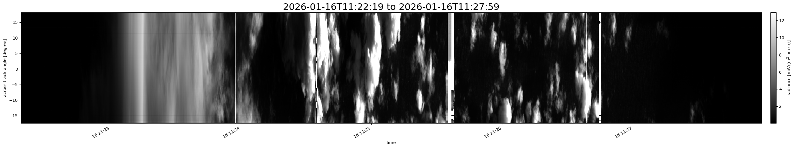 Note that due to the scanning nature of the sensor, the across-track axis is angular resolved while the along-track axis (time-axis) is linear along the flight track.