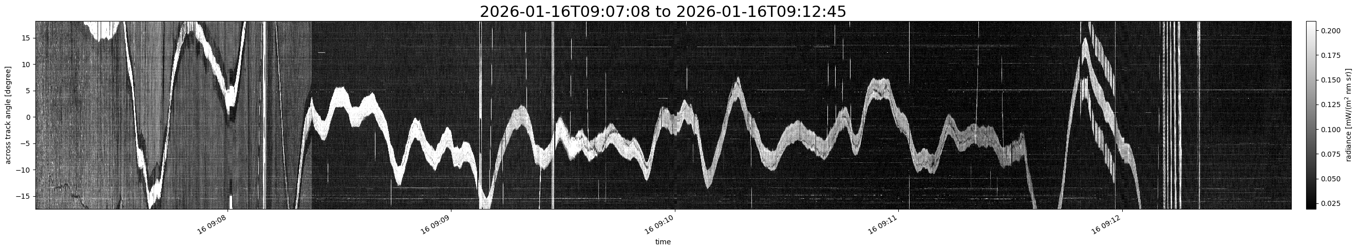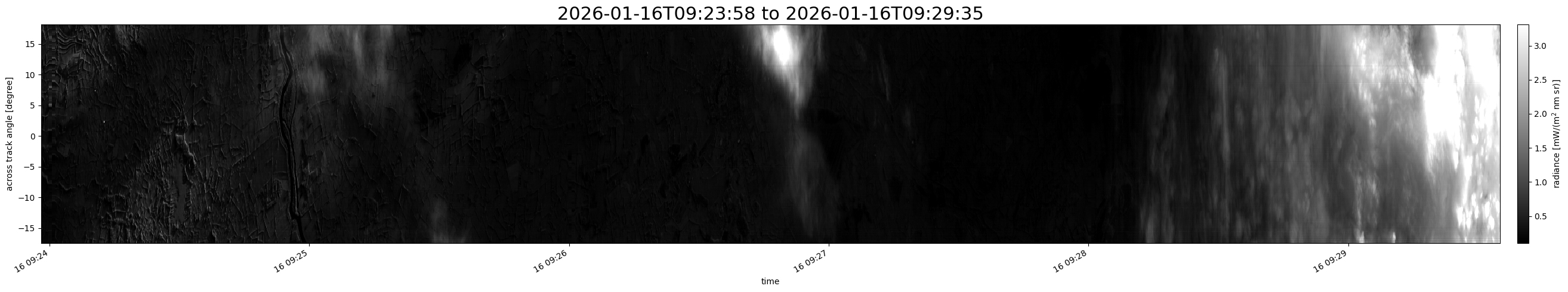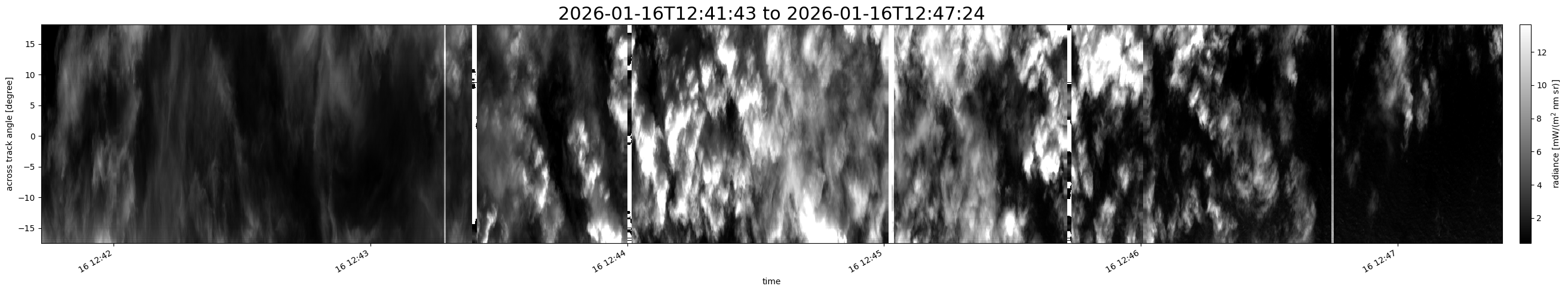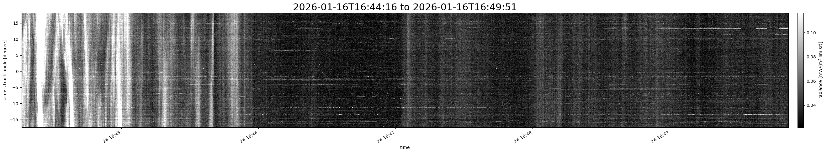 Note that due to the scanning nature of the sensor, the across-track axis is angular resolved while the along-track axis (time-axis) is linear along the flight track.