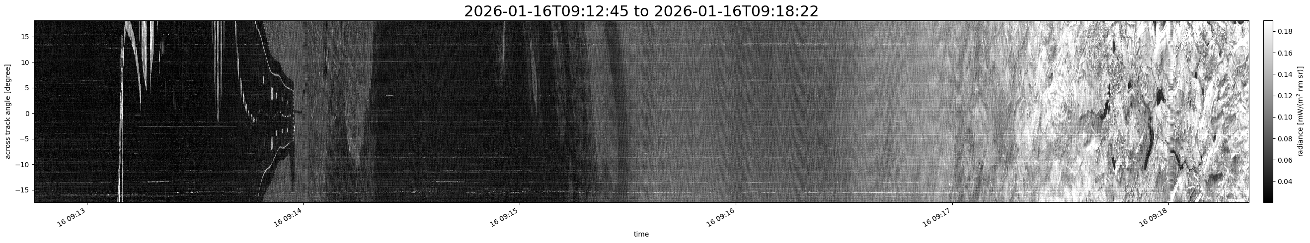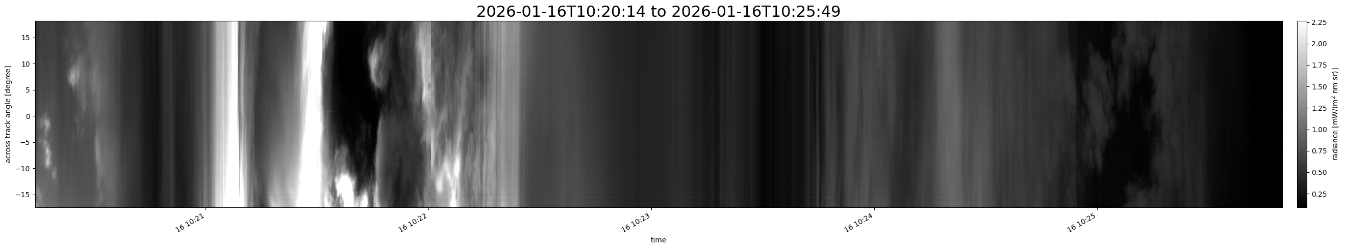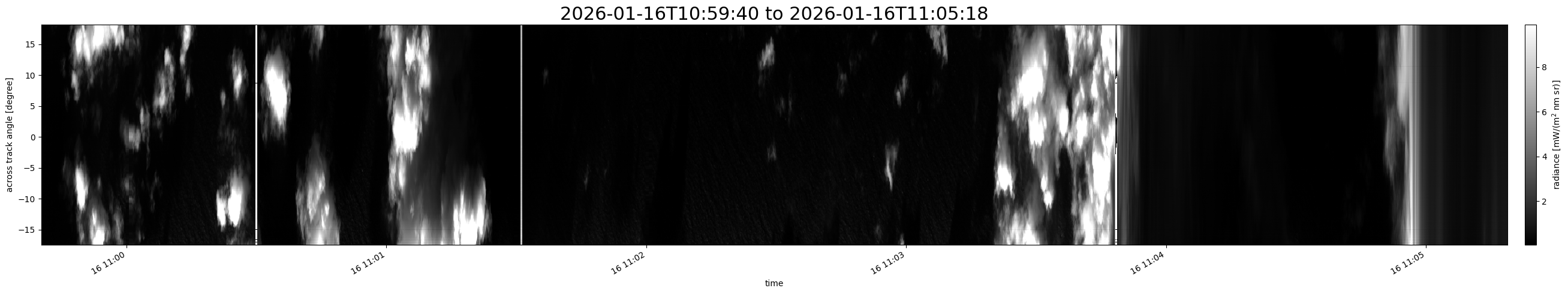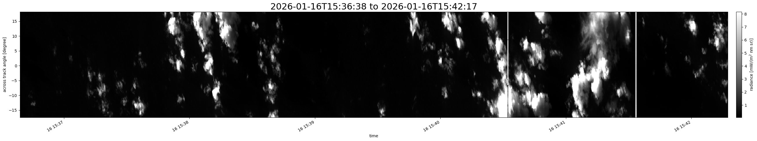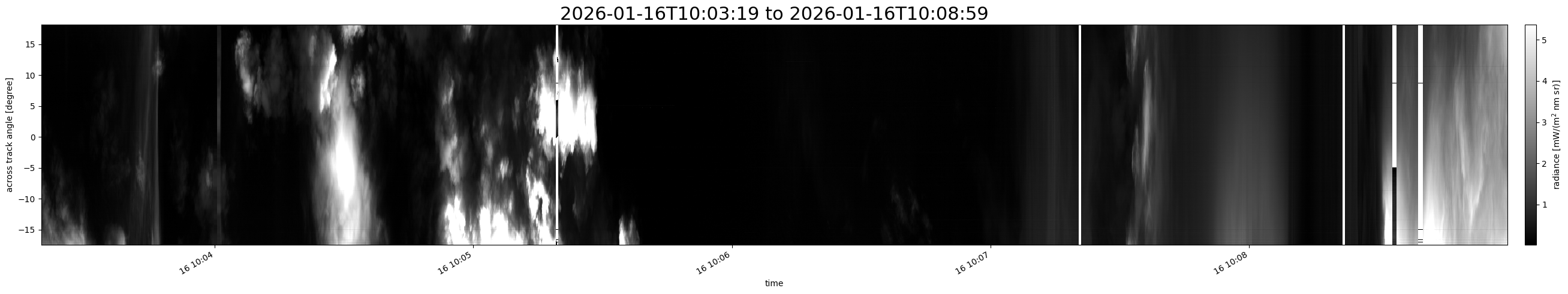 Note that due to the scanning nature of the sensor, the across-track axis is angular resolved while the along-track axis (time-axis) is linear along the flight track.