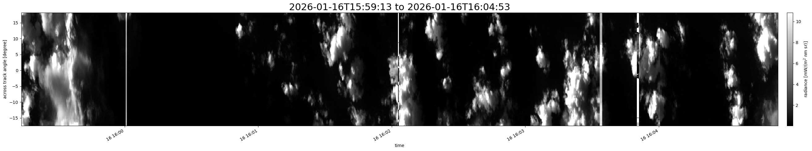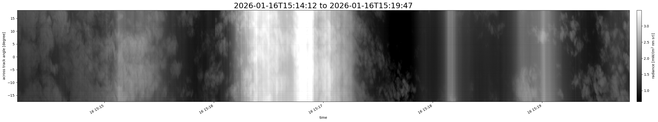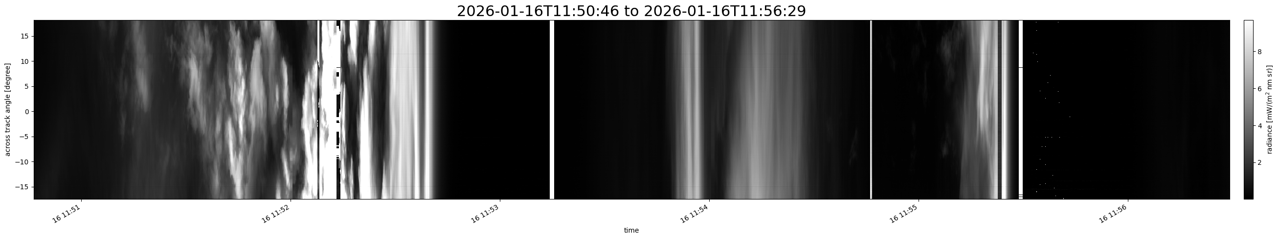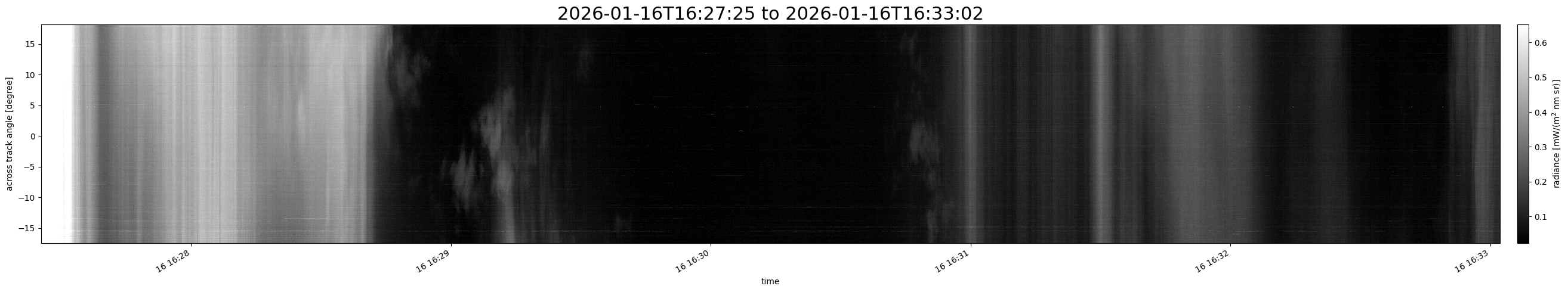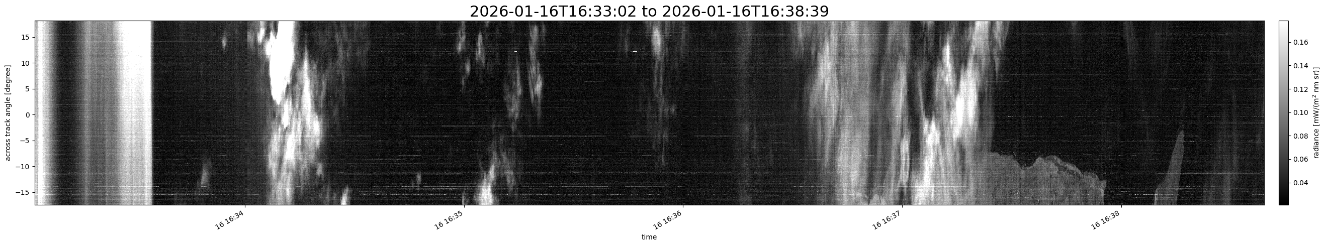 Note that due to the scanning nature of the sensor, the across-track axis is angular resolved while the along-track axis (time-axis) is linear along the flight track.