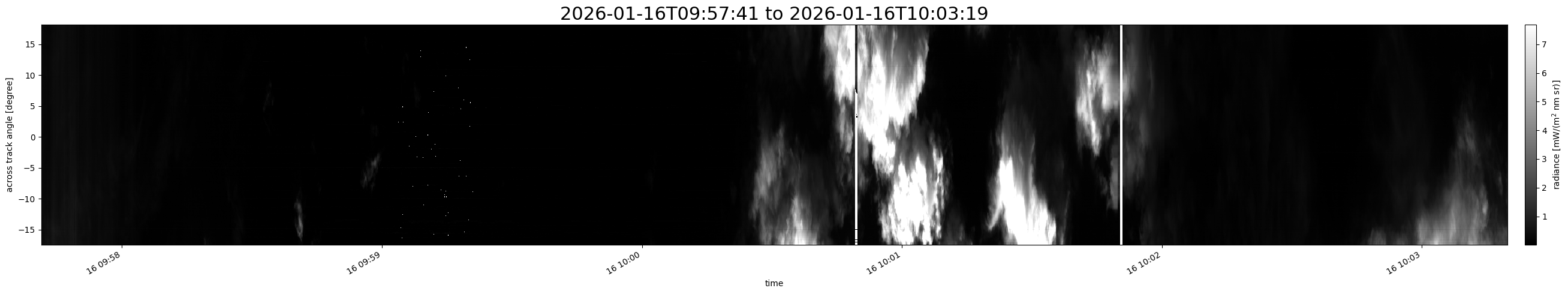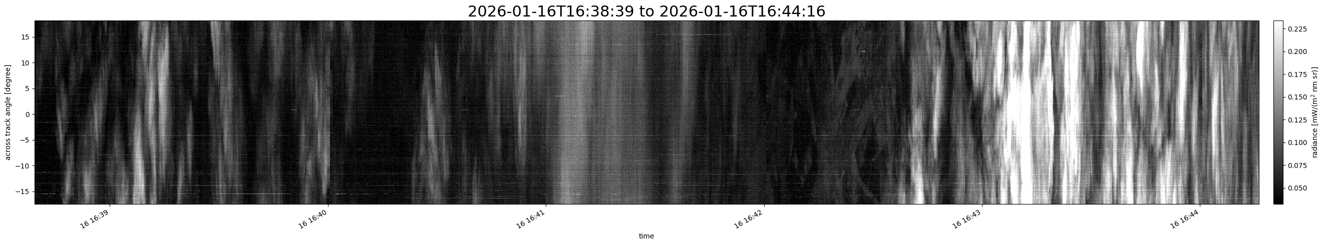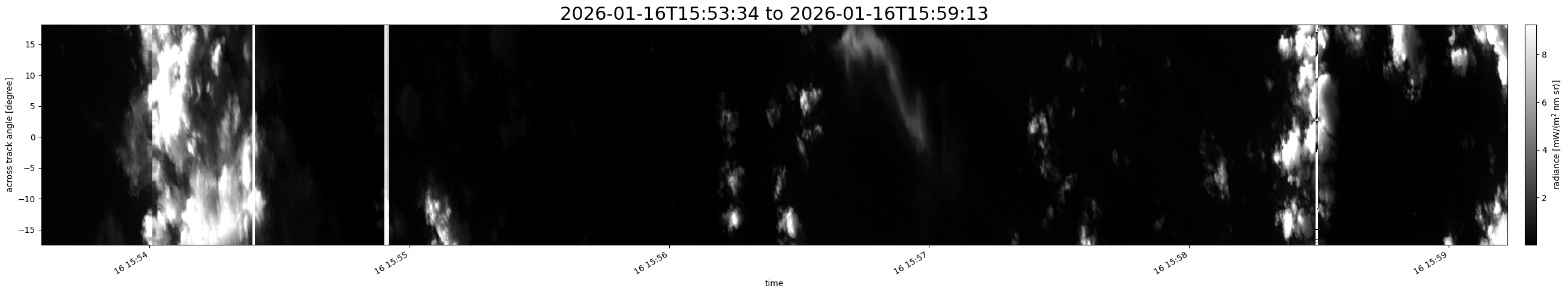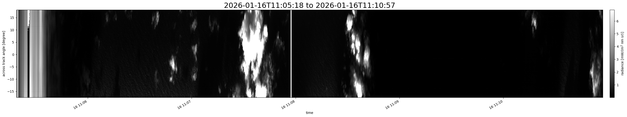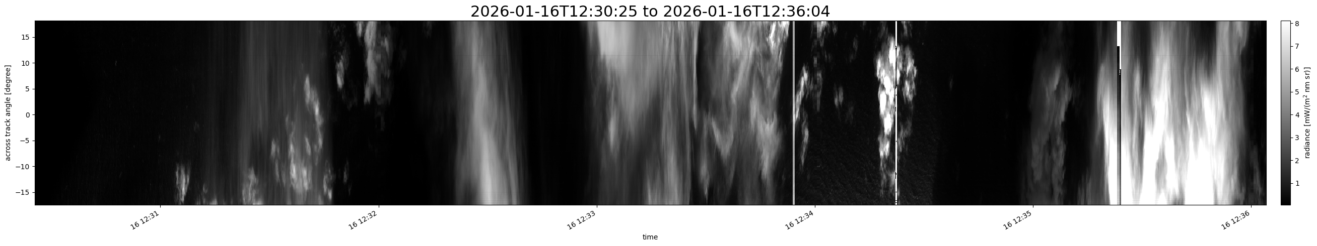 Note that due to the scanning nature of the sensor, the across-track axis is angular resolved while the along-track axis (time-axis) is linear along the flight track.