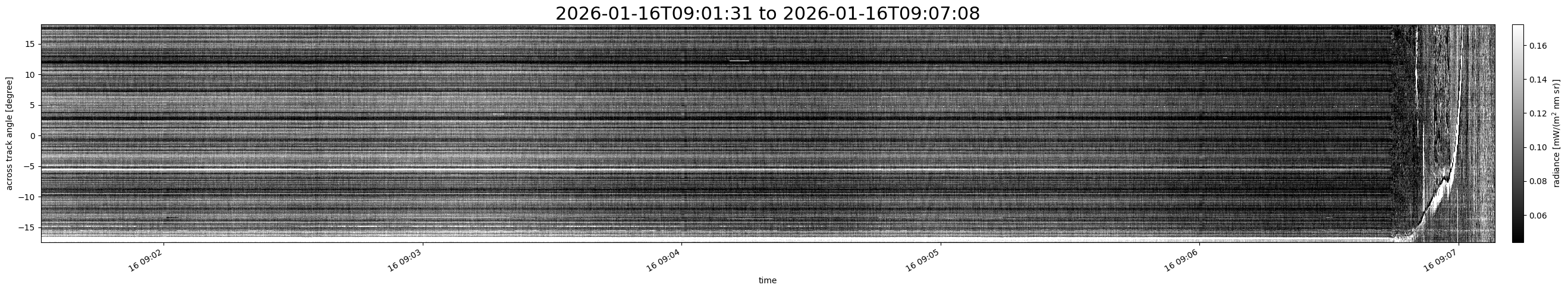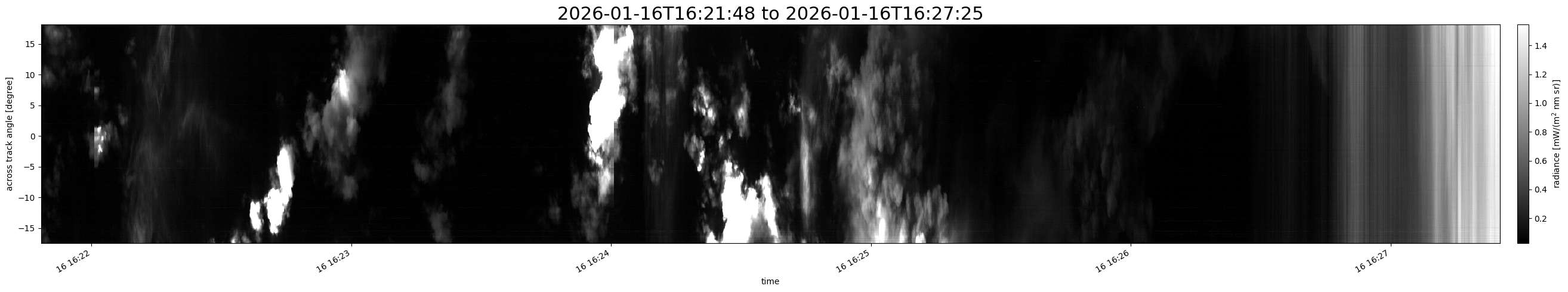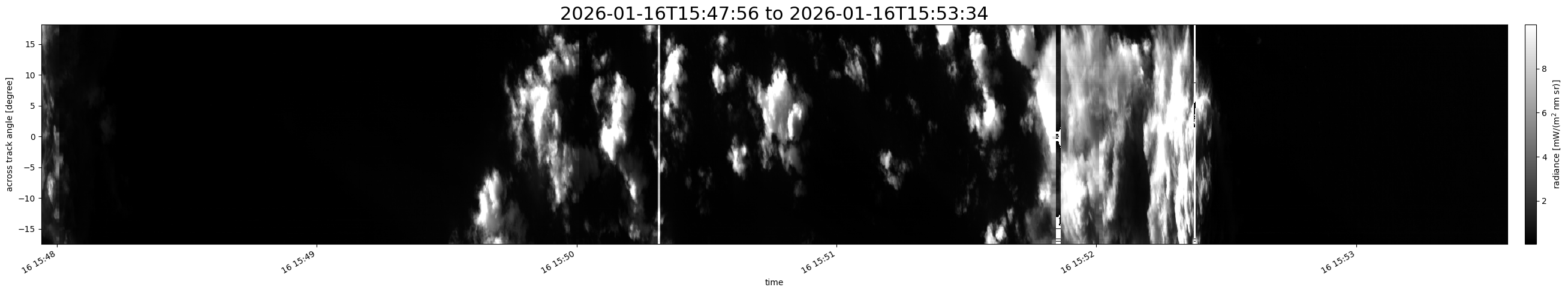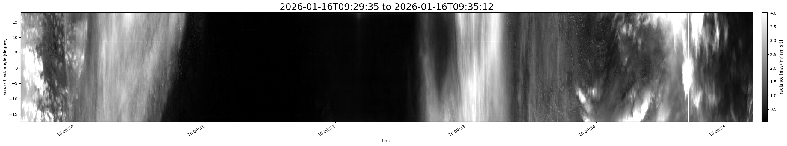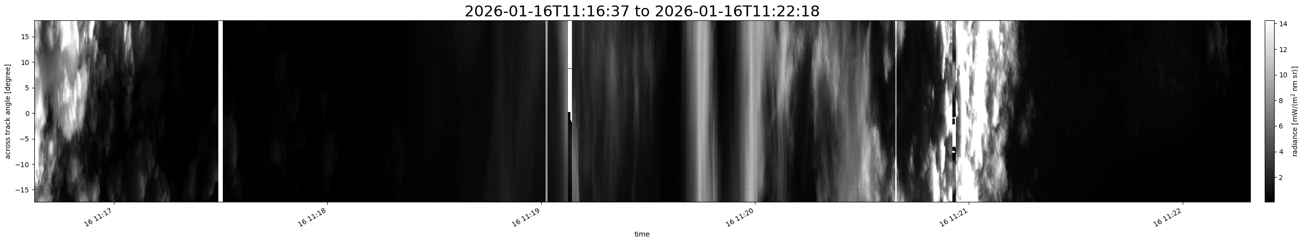 Note that due to the scanning nature of the sensor, the across-track axis is angular resolved while the along-track axis (time-axis) is linear along the flight track.
