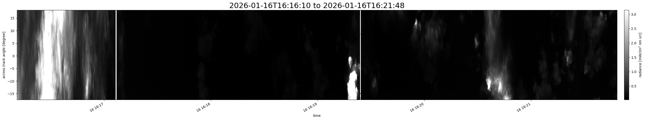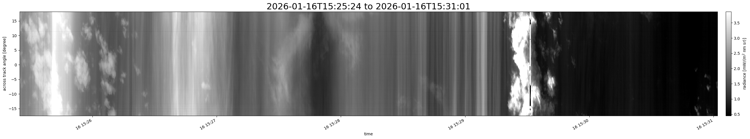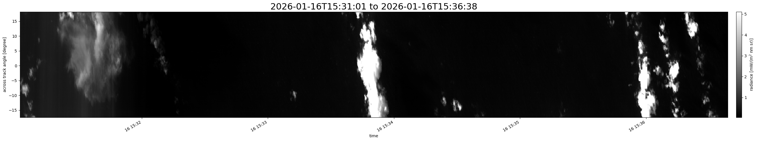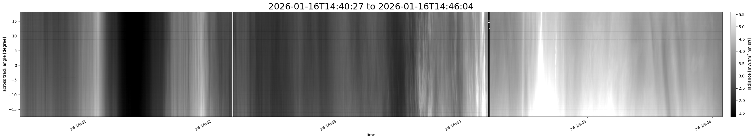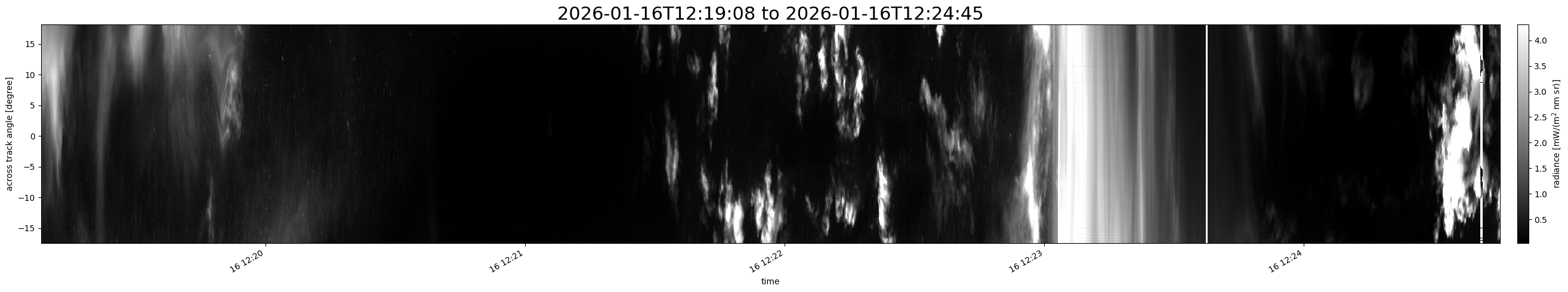 Note that due to the scanning nature of the sensor, the across-track axis is angular resolved while the along-track axis (time-axis) is linear along the flight track.