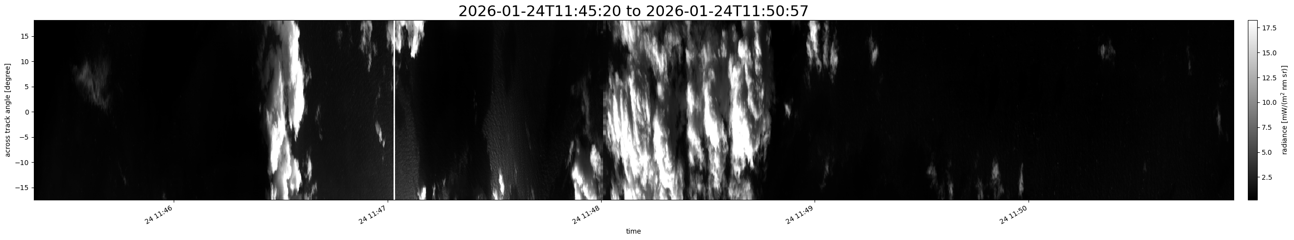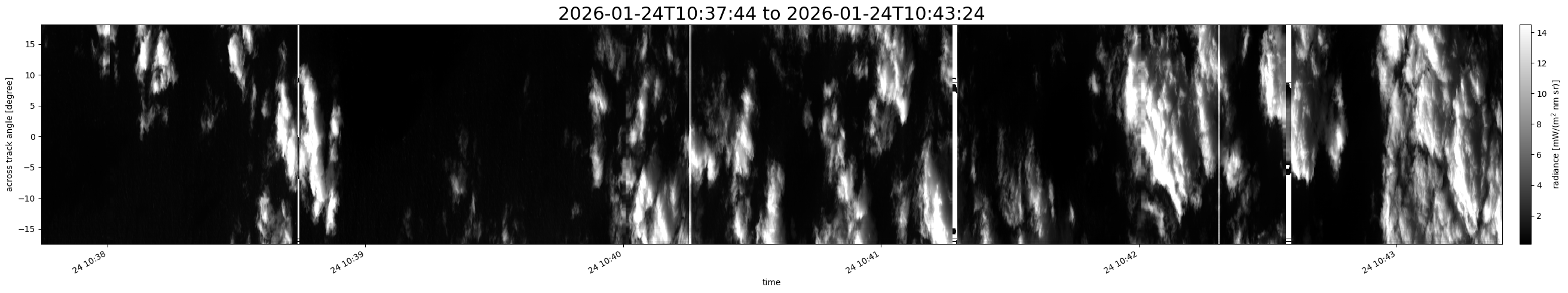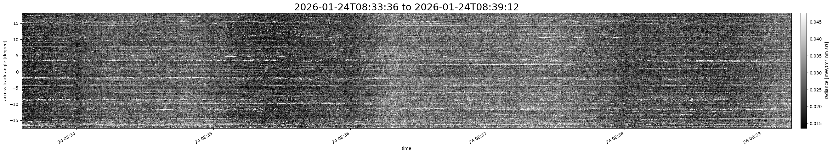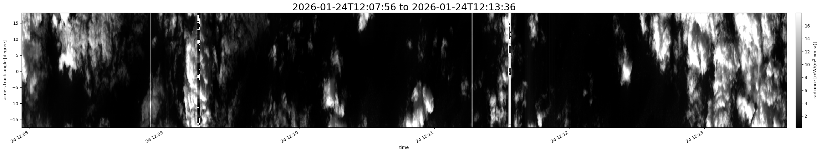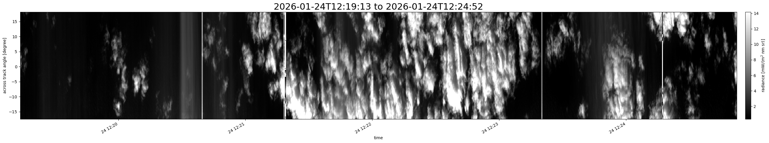 Note that due to the scanning nature of the sensor, the across-track axis is angular resolved while the along-track axis (time-axis) is linear along the flight track.
