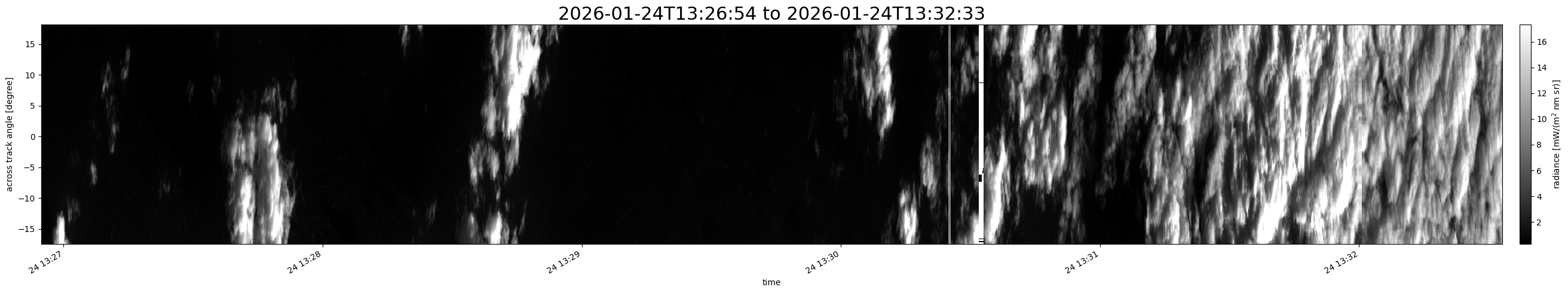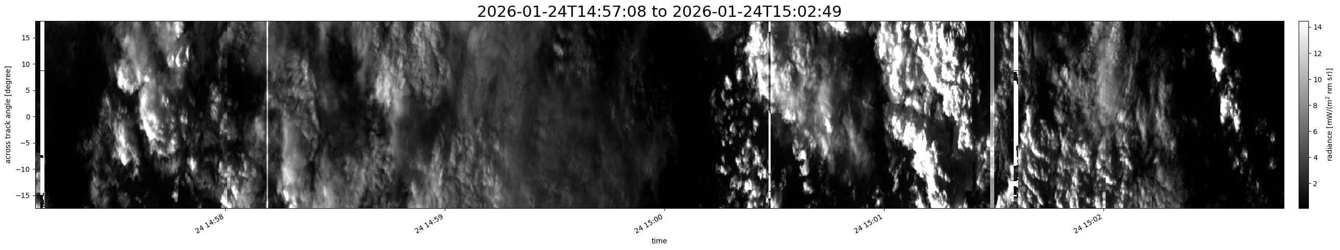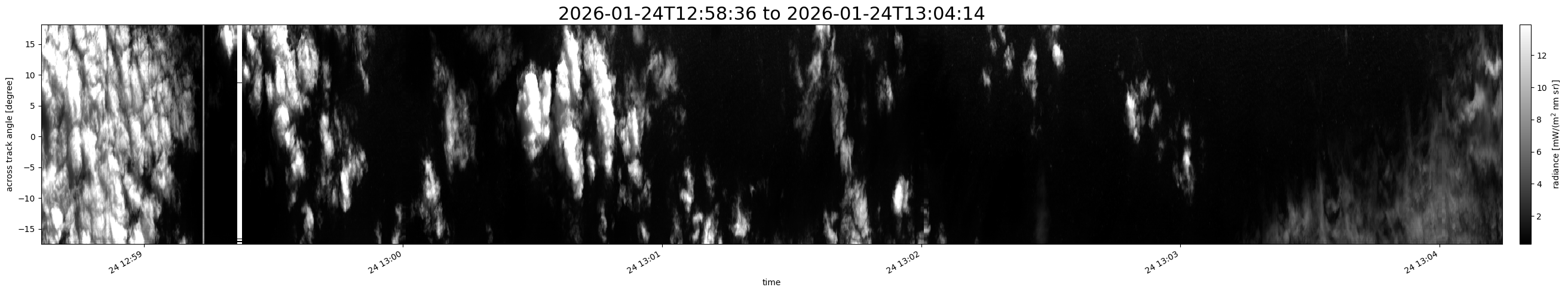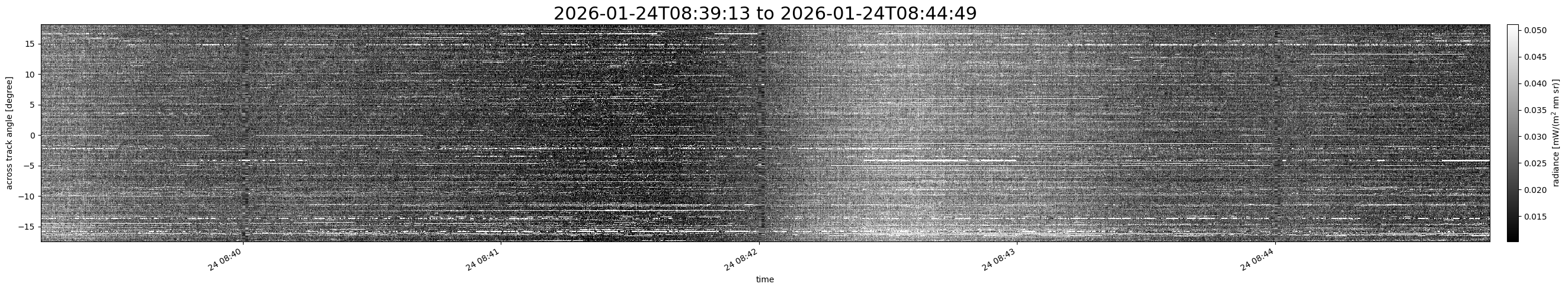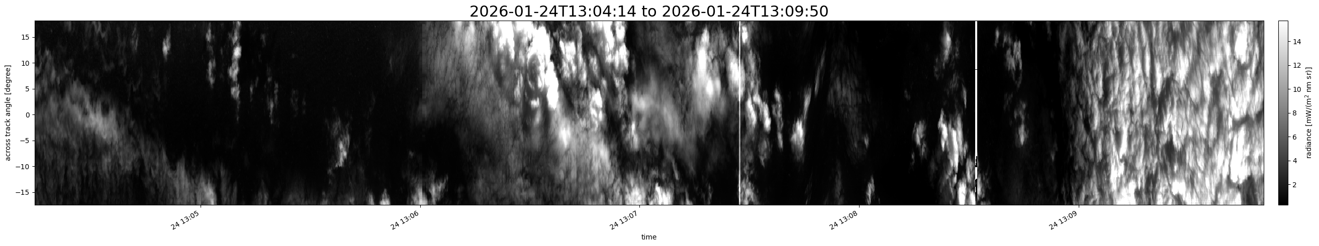 Note that due to the scanning nature of the sensor, the across-track axis is angular resolved while the along-track axis (time-axis) is linear along the flight track.