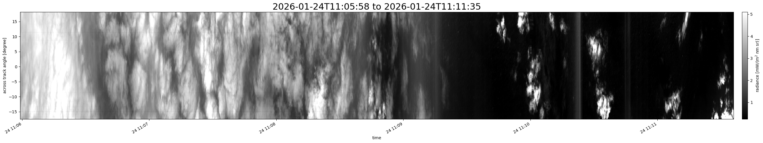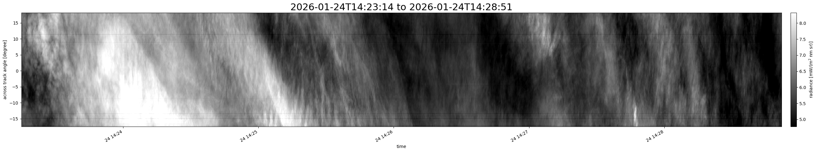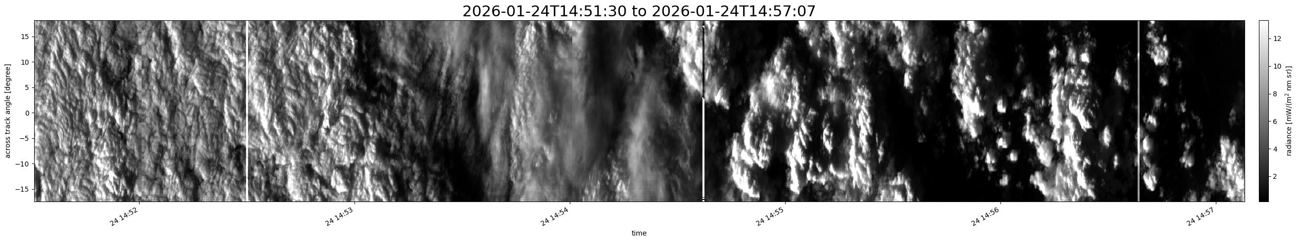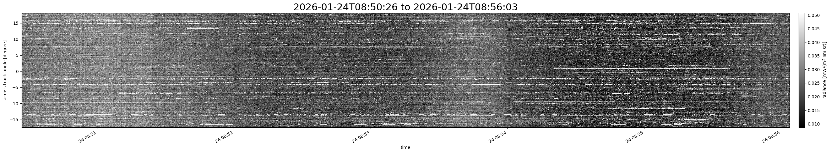 Note that due to the scanning nature of the sensor, the across-track axis is angular resolved while the along-track axis (time-axis) is linear along the flight track.
