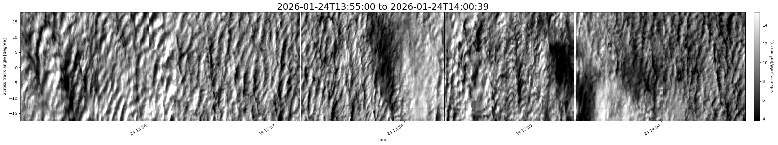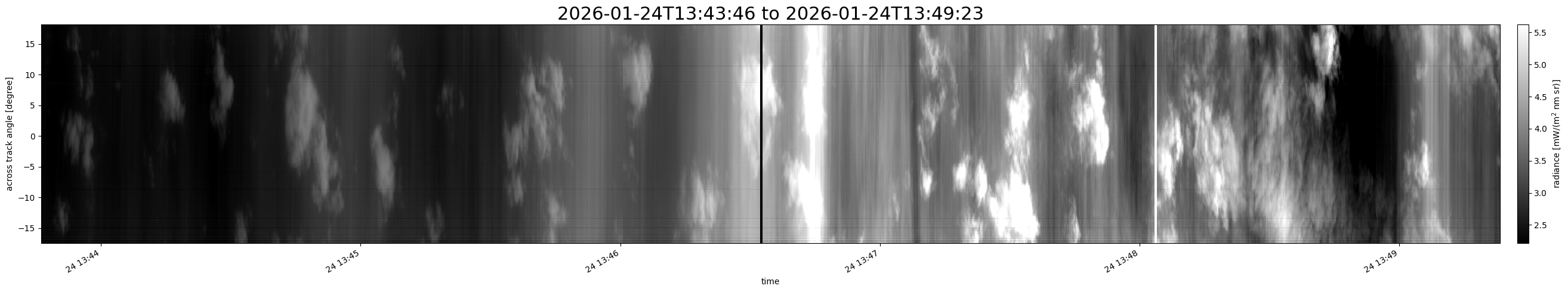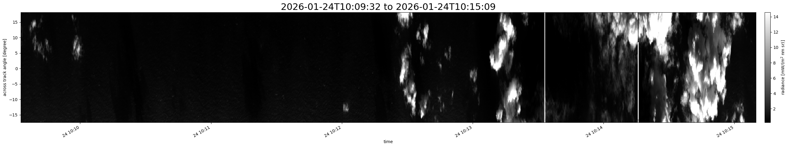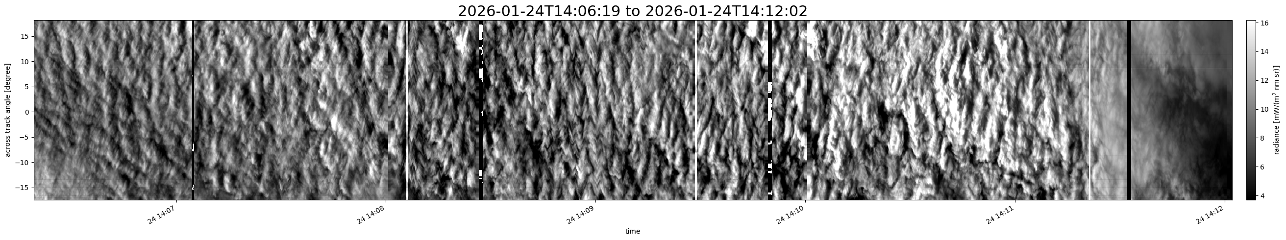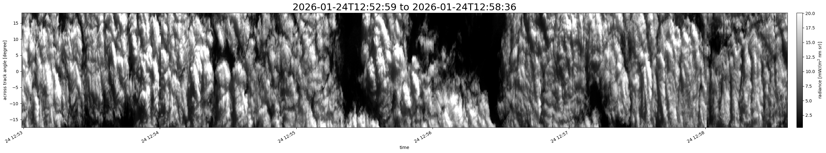 Note that due to the scanning nature of the sensor, the across-track axis is angular resolved while the along-track axis (time-axis) is linear along the flight track.