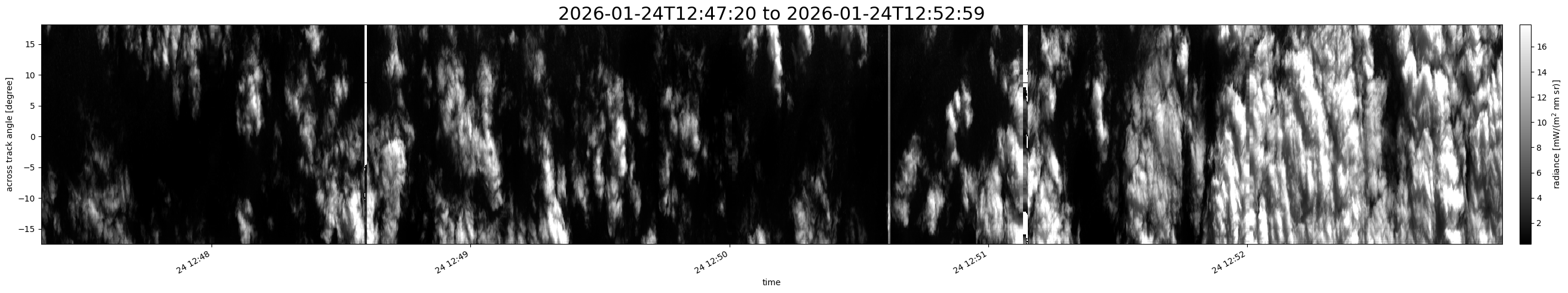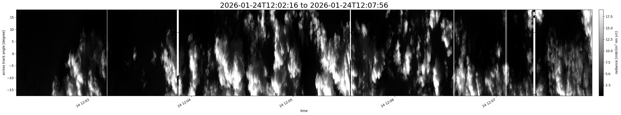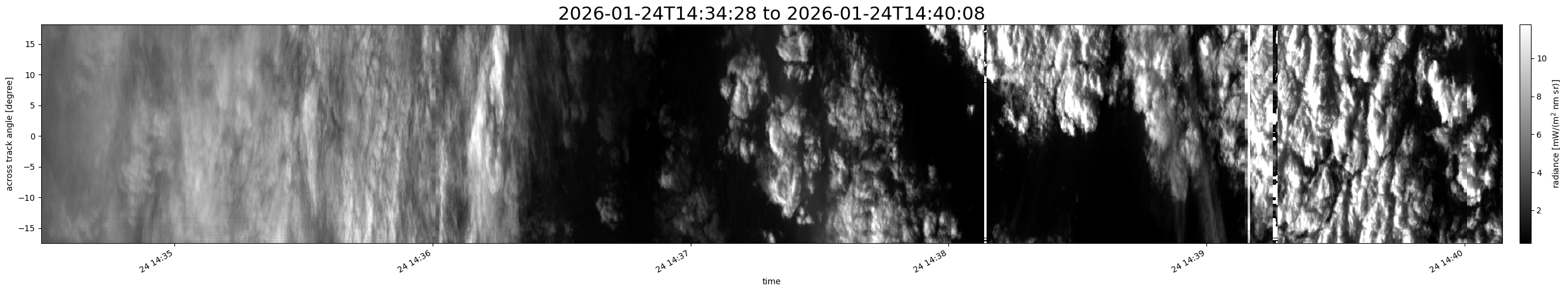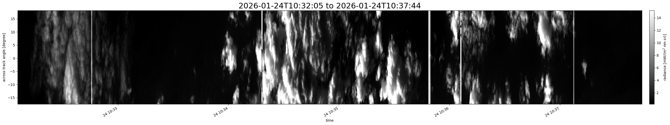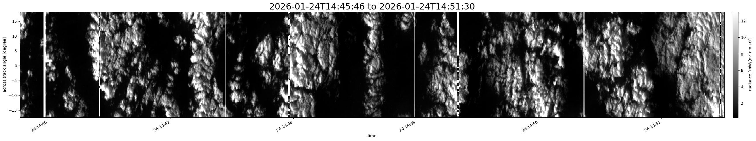 Note that due to the scanning nature of the sensor, the across-track axis is angular resolved while the along-track axis (time-axis) is linear along the flight track.