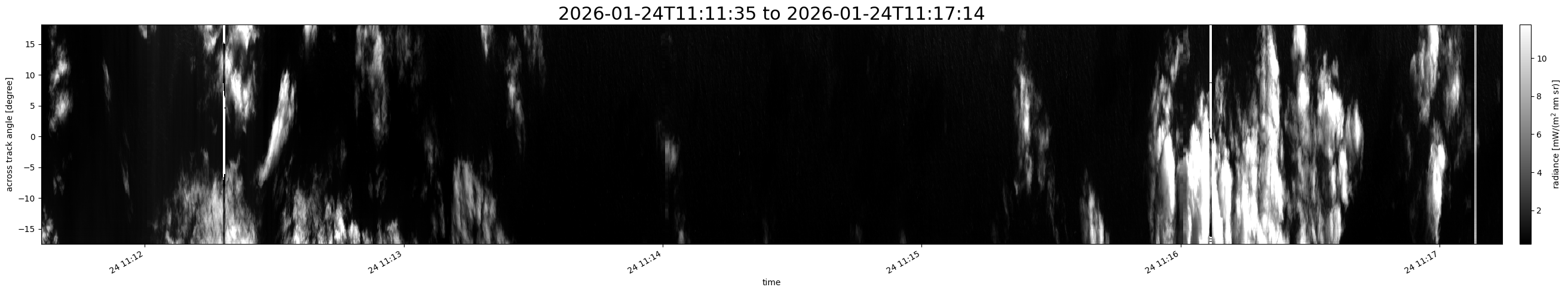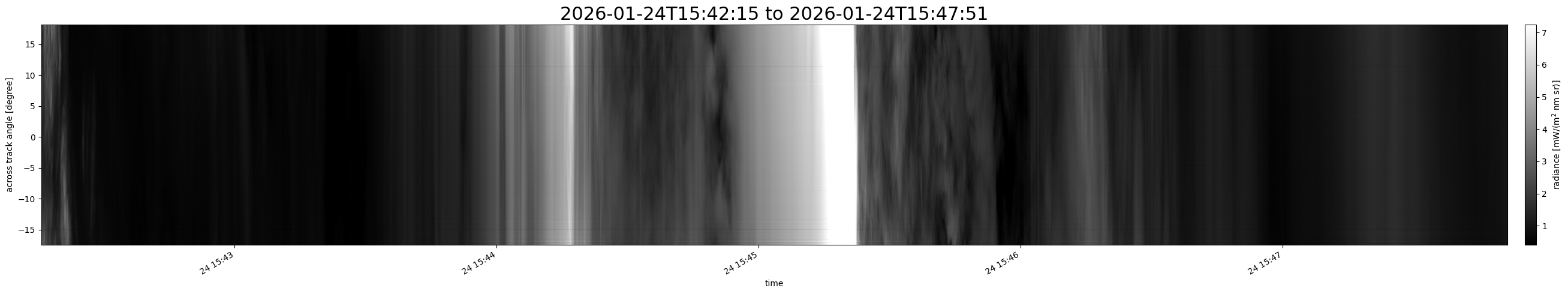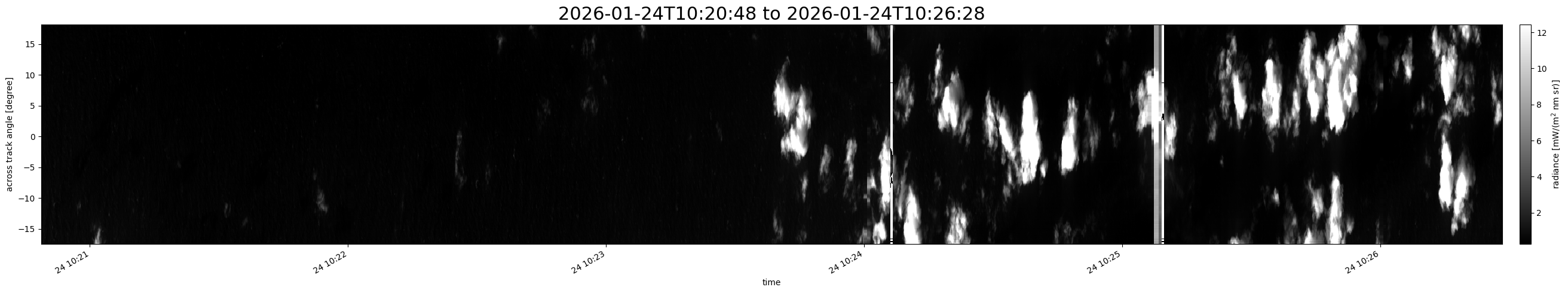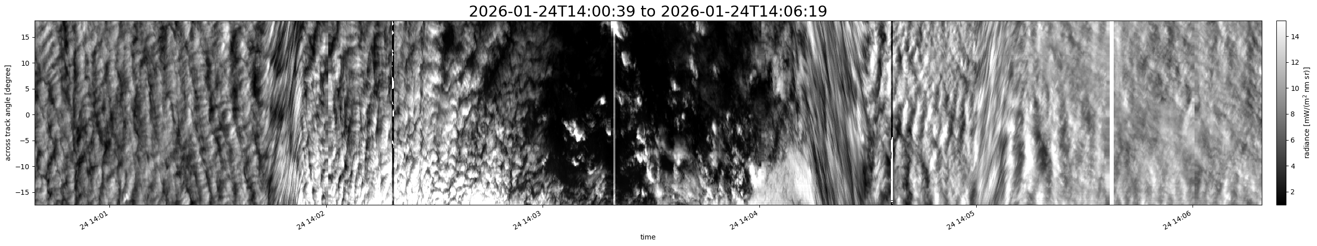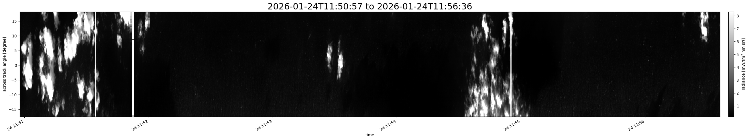 Note that due to the scanning nature of the sensor, the across-track axis is angular resolved while the along-track axis (time-axis) is linear along the flight track.
