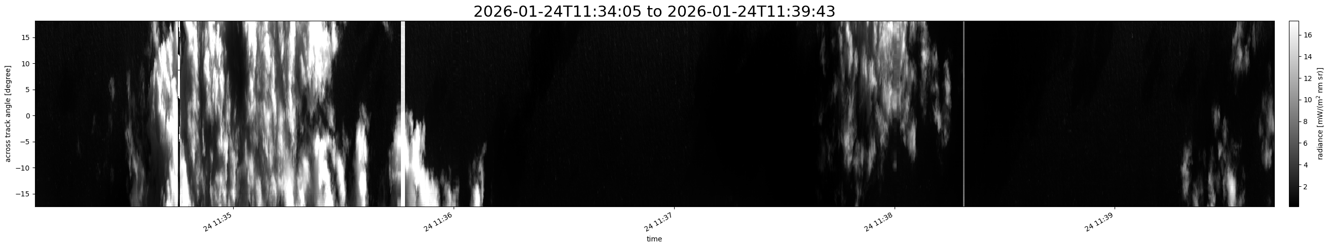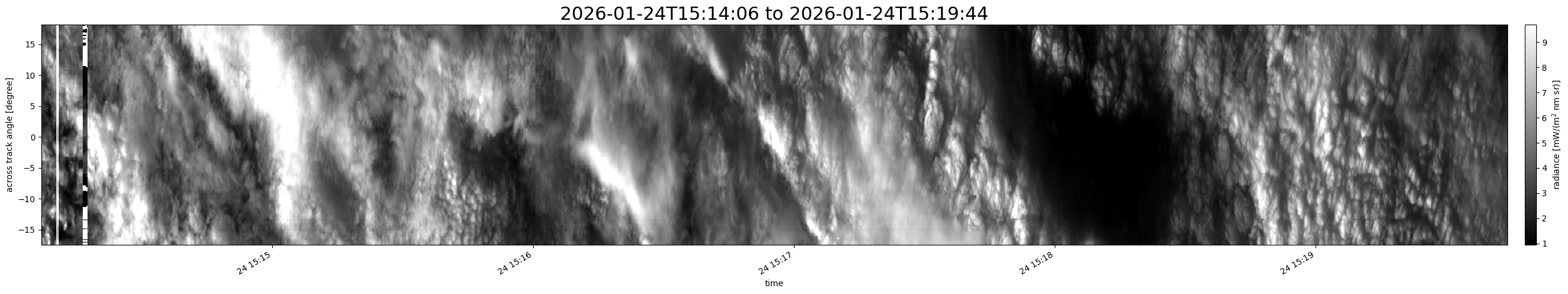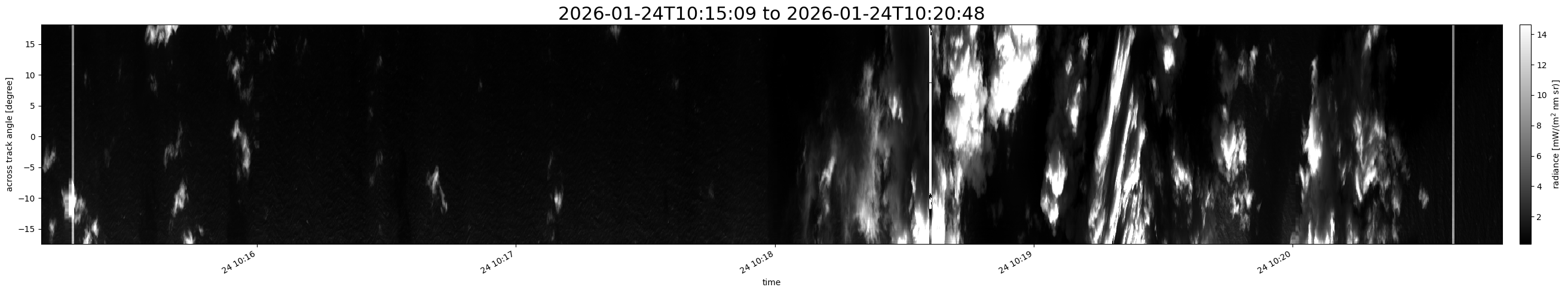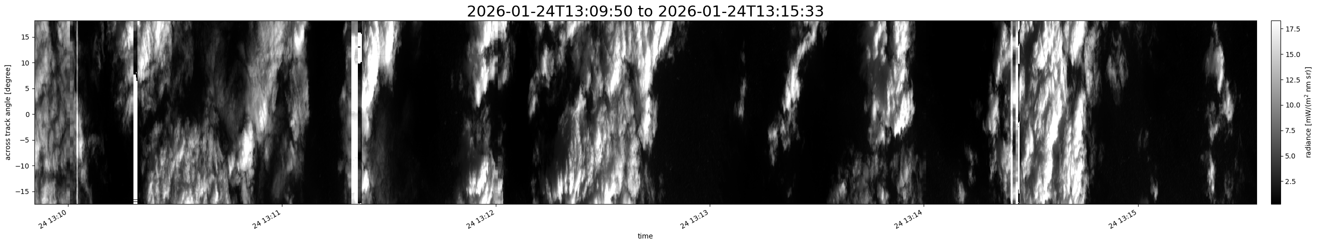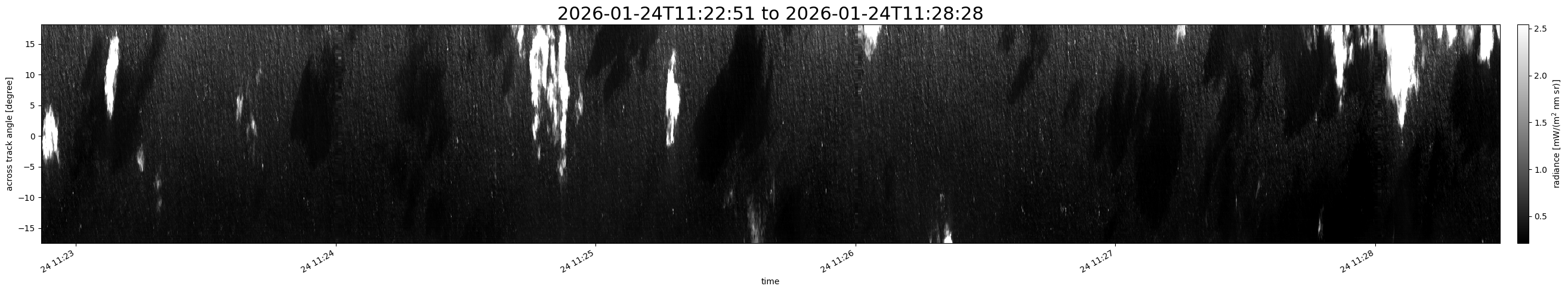 Note that due to the scanning nature of the sensor, the across-track axis is angular resolved while the along-track axis (time-axis) is linear along the flight track.