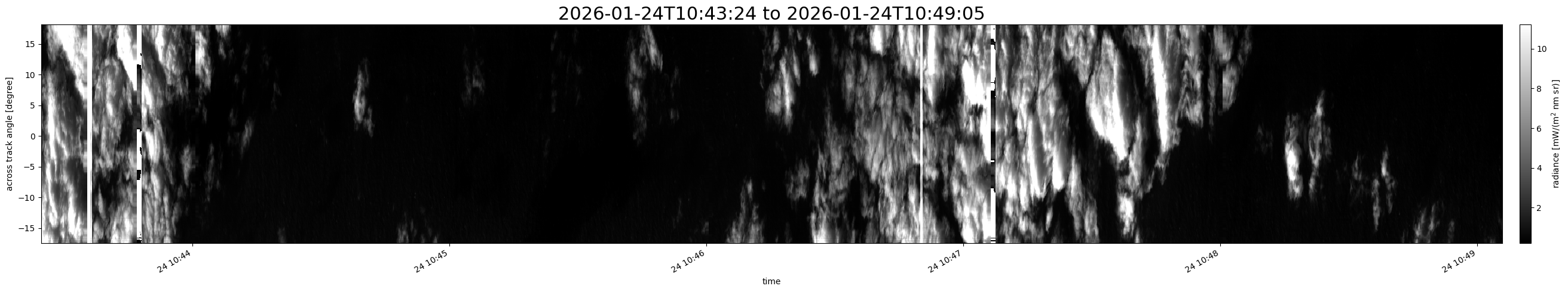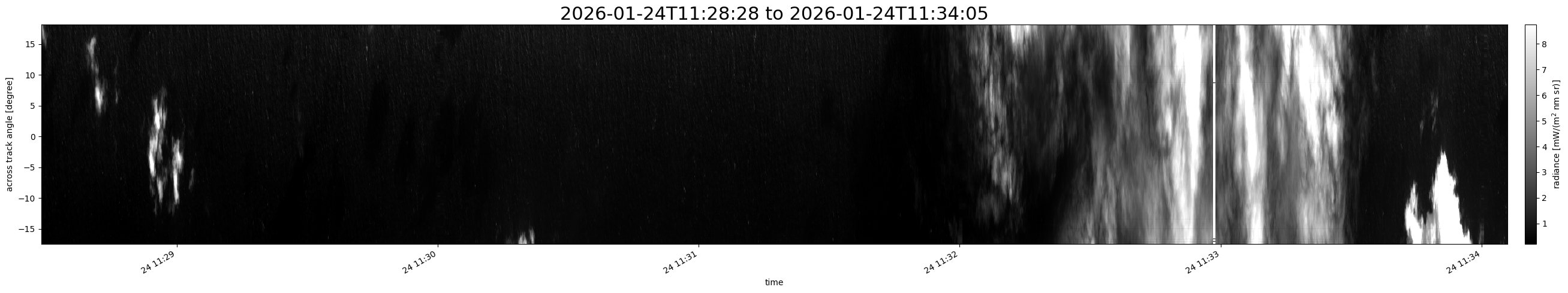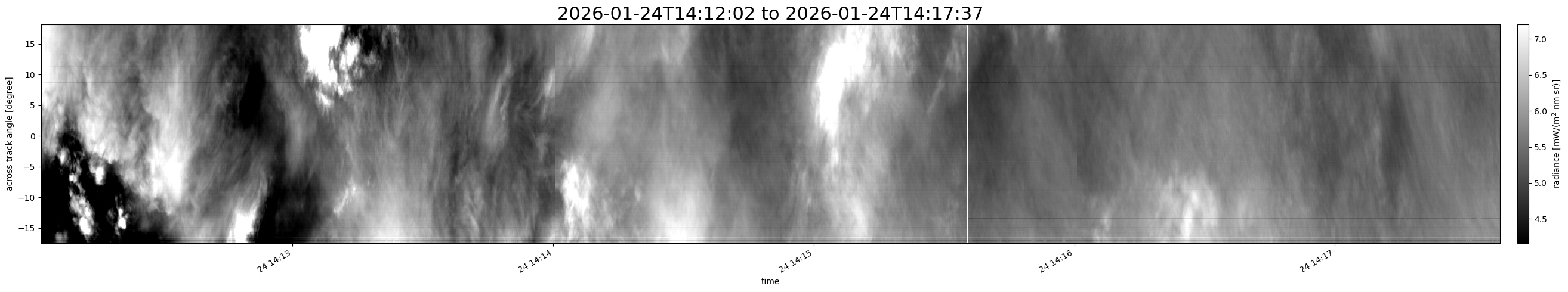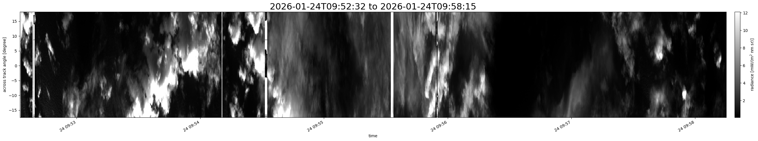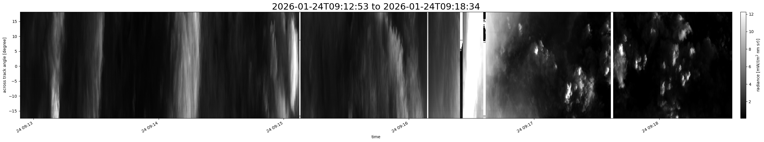 Note that due to the scanning nature of the sensor, the across-track axis is angular resolved while the along-track axis (time-axis) is linear along the flight track.