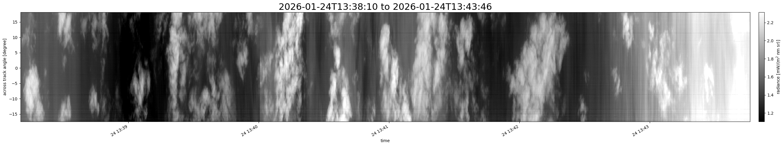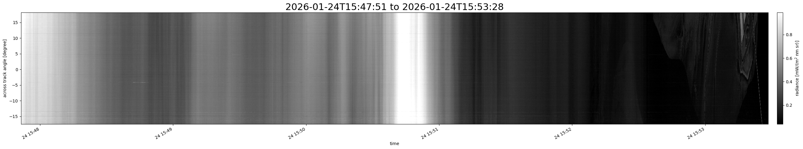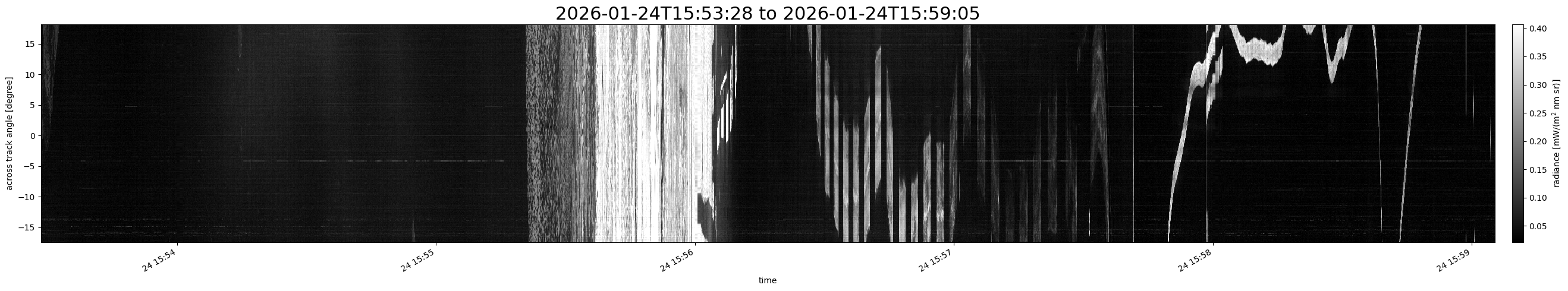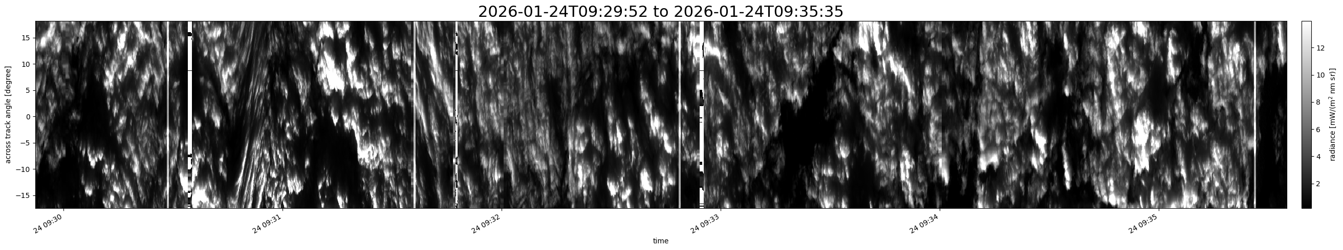 Note that due to the scanning nature of the sensor, the across-track axis is angular resolved while the along-track axis (time-axis) is linear along the flight track.