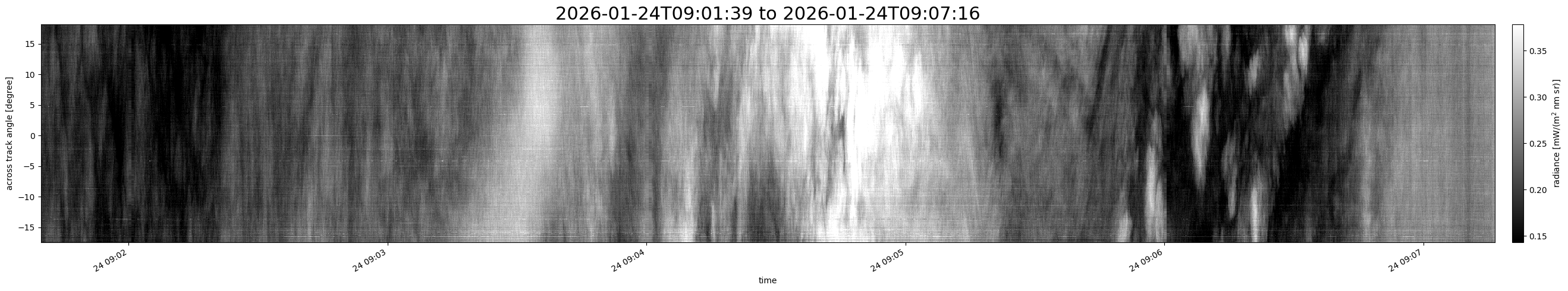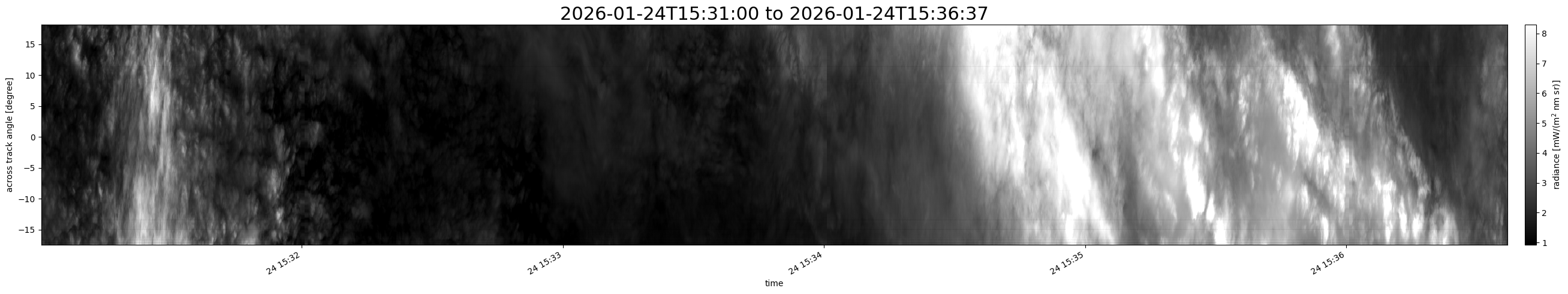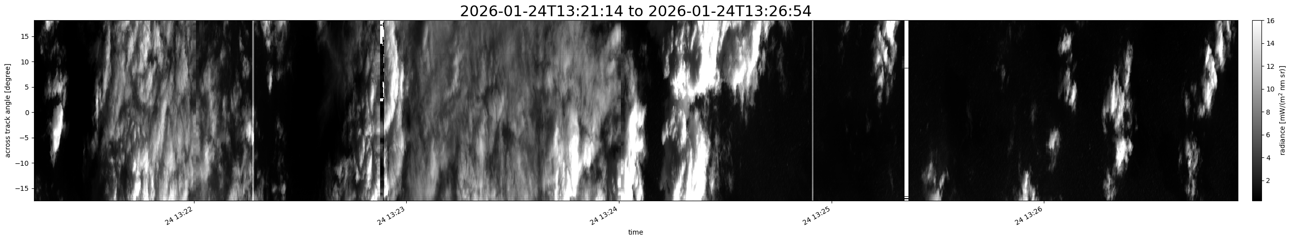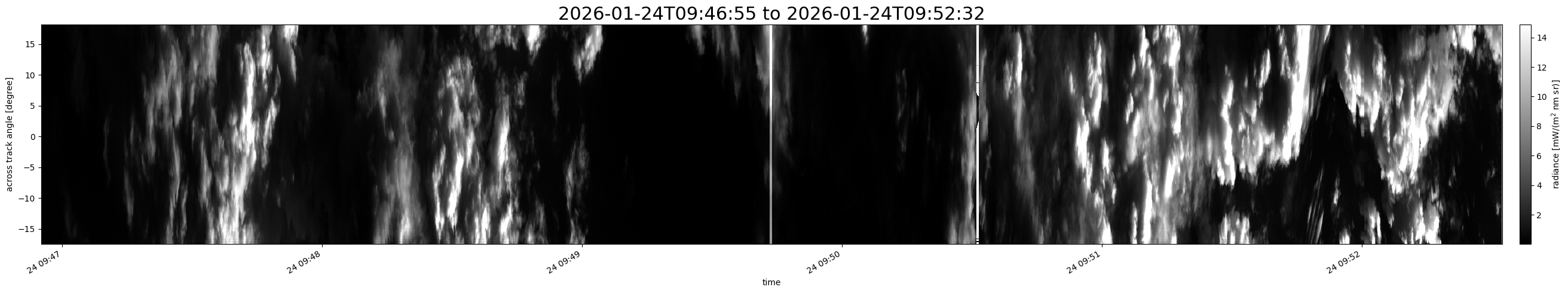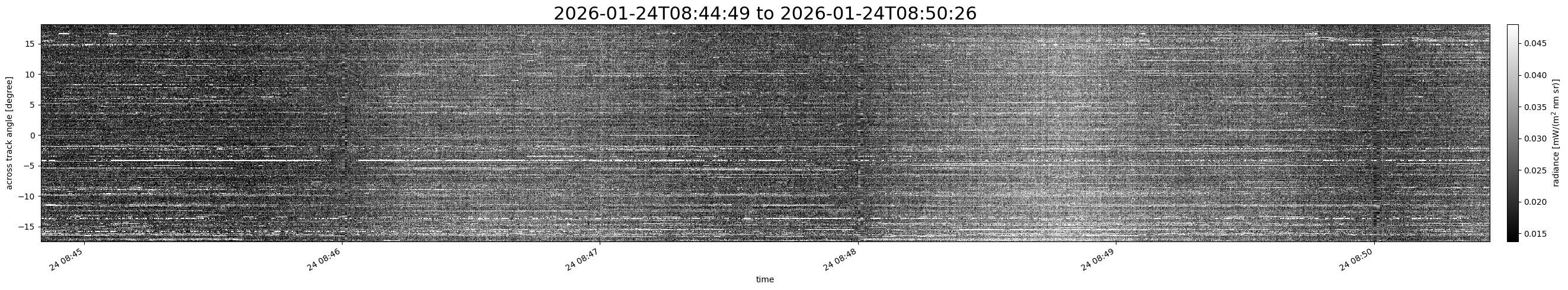 Note that due to the scanning nature of the sensor, the across-track axis is angular resolved while the along-track axis (time-axis) is linear along the flight track.