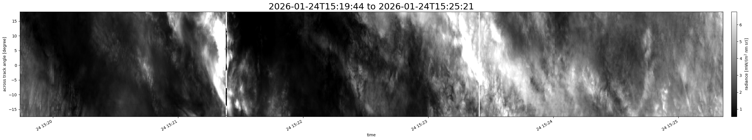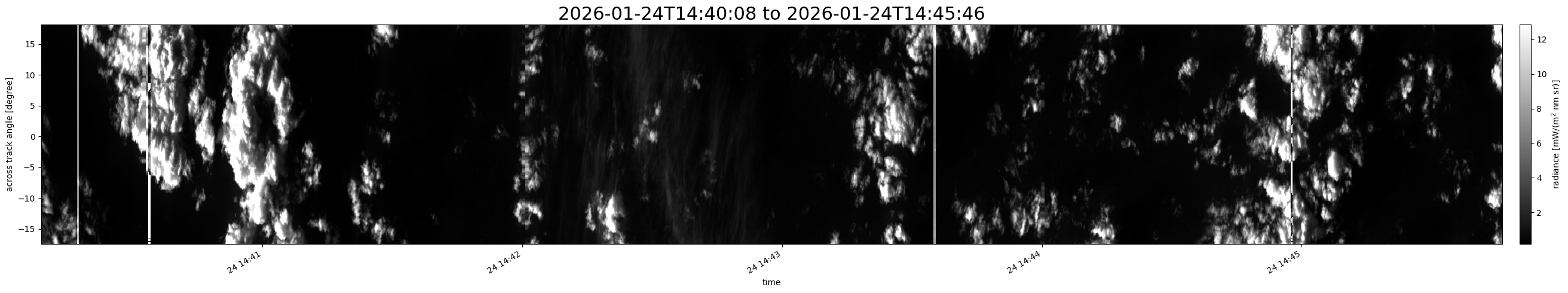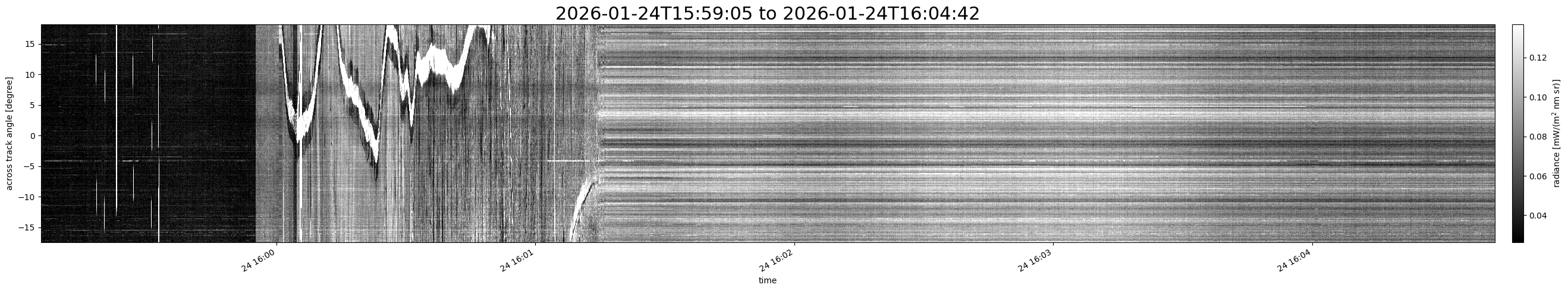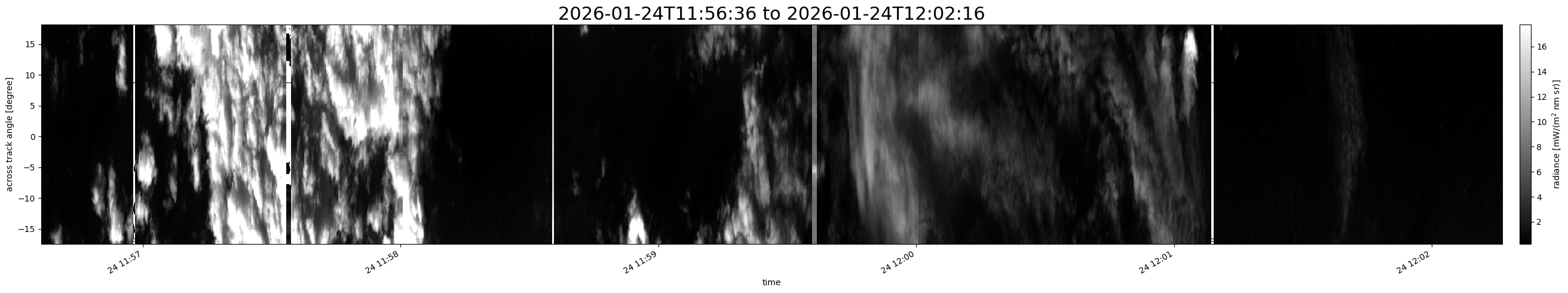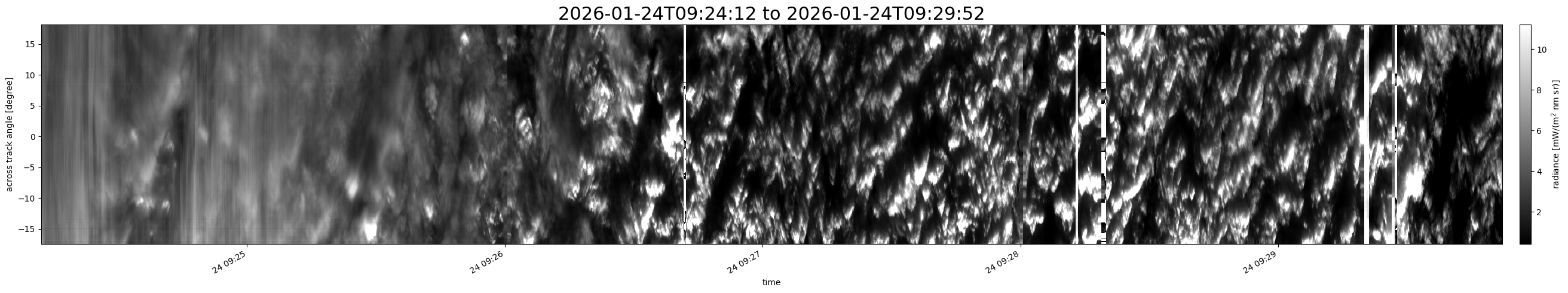 Note that due to the scanning nature of the sensor, the across-track axis is angular resolved while the along-track axis (time-axis) is linear along the flight track.