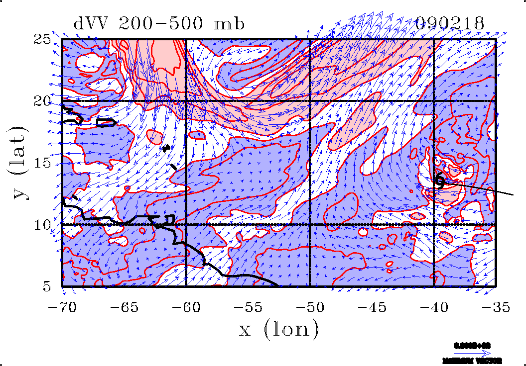 The left column shows the deep layer shear, i.e. the vector wind difference from 850 mb to 200 mb, while the right colum shows the separate contributions from upper level shear, the vector wind difference from 500 mb to 200 mb and the panel below it, the low level shear, the vector wind difference from 850 mb to 500 mb. Regions with a shear magnitude exceeding 15 m s-1 are shaded pink, those with magnitude less than 10 m s-1 are shaded light blue and the region between is shaded white. Contours of shear magnitude have a 5 m s-1 spacing.